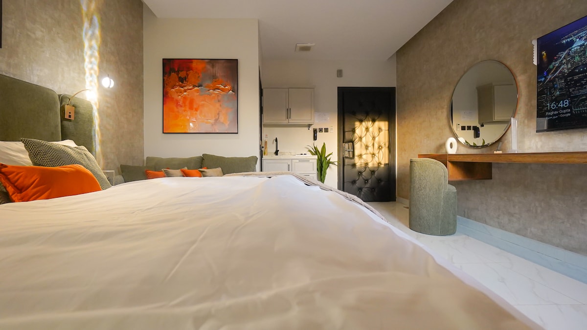 Moodne ühe magamistoaga korter Hittinis, mis on üks Riyadhi parimaid asukohti, mõne minuti kaugusel Boulevard Cityst ja parimatest kohvikutest. Mugav ja lihtne majutuskoht, kus on iseseisev sisseregistreerimine ja täielik nutisüsteem. Majutuskohas on mugav elutuba, mugav magamistuba, 85-tolline nutiteler ja elegantne elektrikamin, mis loob lõõgastava õhkkonna. Täielikult varustatud köök ahju, mikrolaineahju, elektripliidi, nõudepesumasina ja pesumasinaga. Puhas, stiilne ja ideaalne paaridele, ärireisijatele ning lühiajaliseks või pikemaks peatumiseks.