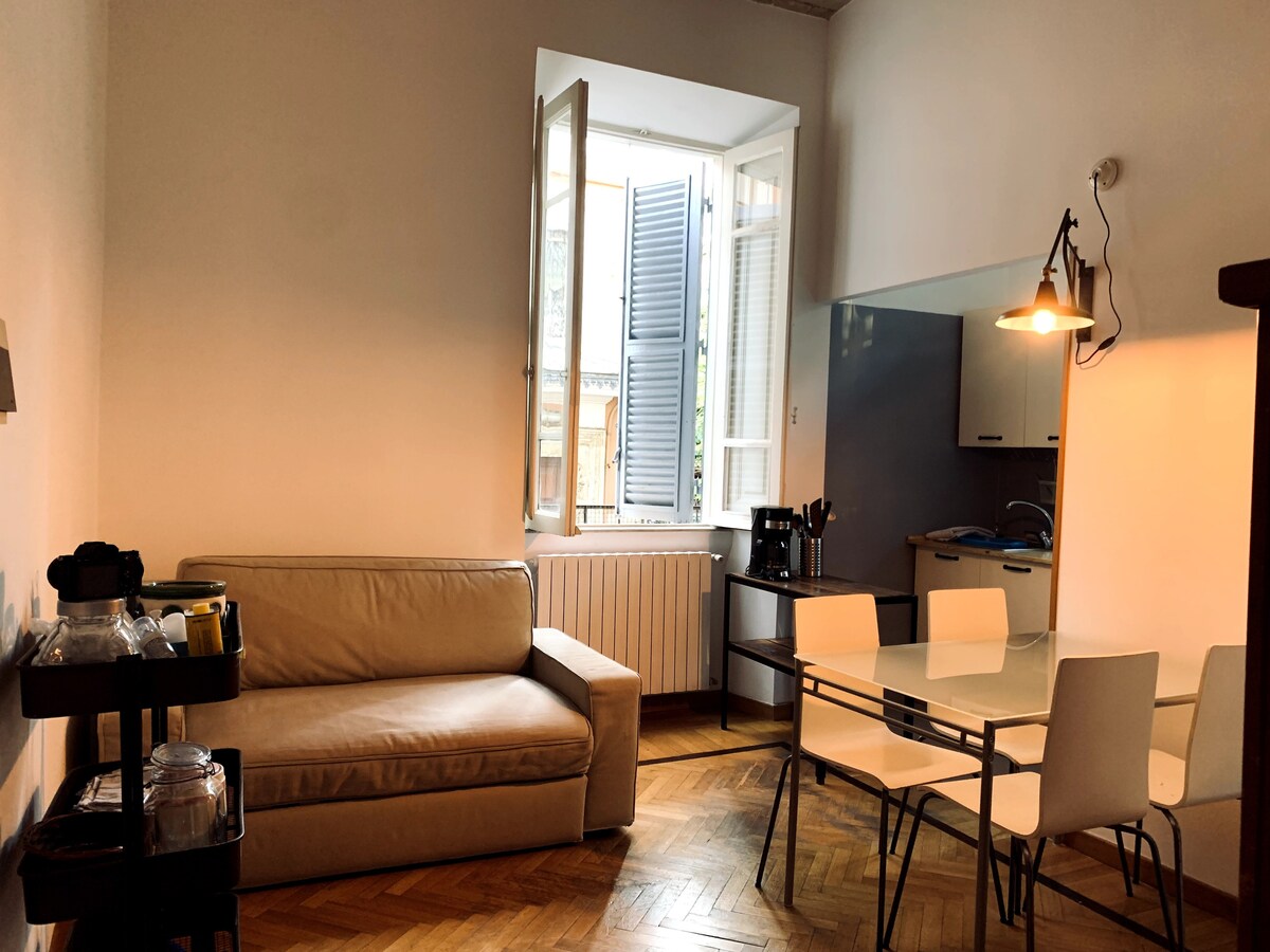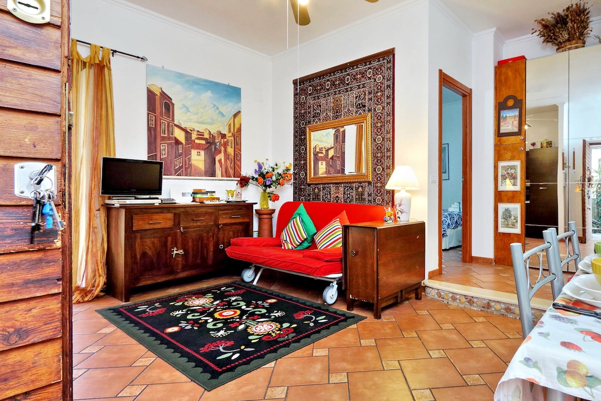 Hubane korter, kus on 1 magamistuba kaheinimesevoodi ja 1 täiendav üheinimesevoodi, + diivanvoodi elutoas elutoas kahekorruselises majas, mis pärineb 1900. aastate algusest ja kus on autentsed freskod. Täiesti uuendatud. Kliimaseade ja küte kõigis tubades. Teler, nõudepesumasin ja pesumasin. Pigneto piirkond, üks trendikamaid Roomas. Metroo lähedal (180 mt Pigneto peatus), bussid (isegi öösel), trammid. Hästi ühendatud Colosseumi, kesklinna ja Terminiga (2,5 km). Töölaud sülearvuti jaoks
