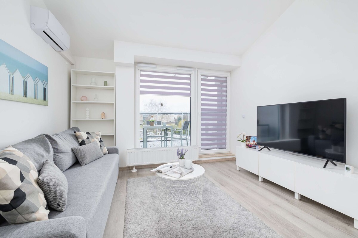 Nowoczesny, przytulnie urządzony i kompleksowo wyposażony 46 metrowy apartament znajdujący się na strzeżonym, cichym osiedlu, dysponujący własnym miejscem parkingowym w garażu podziemnym. Jasna sypialnia z podwójnym łóżkiem, kuchnia wyposażona w zmywarkę piekarnik, mikrofalę, toster i ekspres do kawy. Świeża kawa, wypita w przestronnym ogródku to tylko jedna z wielu rzeczy które umilą Twój pobyt. Szybkie Wi-fi, telewizja kablowa, czy kino domowe zapewnią Ci rozrywkę po relaksującej kąpieli.