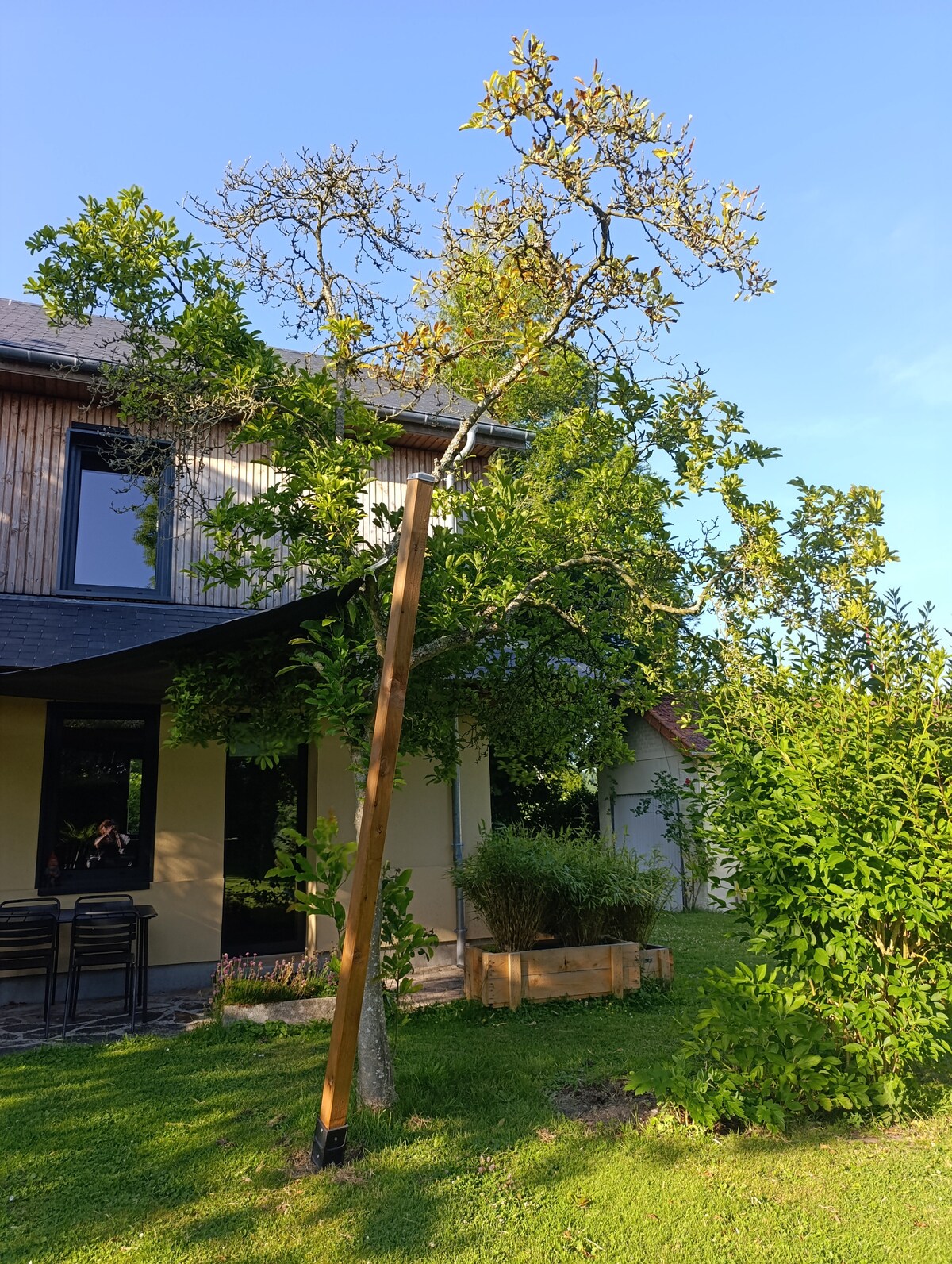 Notre gîte est séparée de notre demeure par un joli jardin paysagé . Entièrement refait à neuf , nous avons eu à cœur de le meubler avec goût et faisons en sorte que nos hôtes se sentent comme chez eux et ne manquent de rien durant leur séjour . Les amateurs de vélo pourront arriver chez nous via la voie verte qui passe derrière la maison et garer leurs vélos chez nous à l'abri .