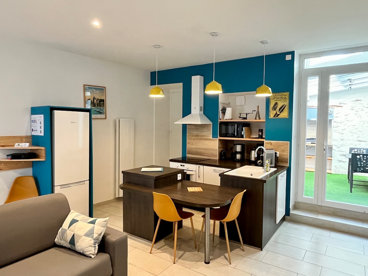 Maison de 40 m² juste rénové à 200 m de la plage et 200 m des commerces dans une rue calme. Dans cette maison vous trouverez tous les équipements. -Une chambre avec dressing et un lit 160*200 -Un salon avec un canapé lit de 140*190, TV écran plat et internet. -Une cuisine équipée (plaque induction, frigo, four micro-ondes combiné, lave-linge, machine à café Senseo. ) -Une salle de bain avec toilettes, douche à l’italienne et une vasque -Une véranda avec coin repas -Un jardin de 60 m² clos