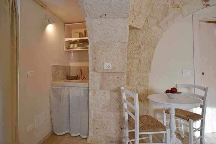 Maja on 1800. aastatest pärit trullo, täielikult renoveeritud, varustatud kütte ja kliimaseadmega, nutiteleriga ja WiFi-ga. Magamistoas on kaheinimesevoodi, öökapid, lugemislambid ja riidekapp. Toas, mis on varustatud külmiku, mikrolaineahju, rösteri ja espressomasinaga, on diivanvoodi; saad süüa ja einestada laua taga 4 inimesele. Toast pääseb vannituppa, kus on pesumasin, soe vesi, kõik tualetiseadmed, kraanikauss, bidee ja dušikabiin.