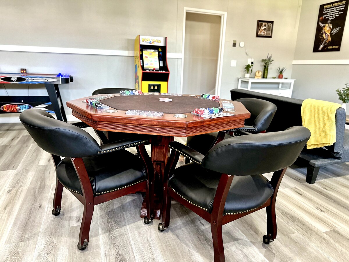 Imeilus 3 magamistoa / 2 vannitoaga ühekorruseline majutuskoht, millel on PRIVAATNE soojendusega BASSEIN, mis tundub nagu 5-tärni kuurort, kus on TASUTA EV-laadimine sinu autole. Ilus tagahoov, grill ja 12-kohaline puhketuba, vesiliumäega bassein ja mullivann. Kamin, 85-tolline OLED-teler, tööruum, kiire WiFi, jõusaal. Täielikult varustatud köök, 6-põletiga gaasipliit, riisipliit, kohvimasin jne. Pesumasina/-kuivatiga pesuruum, triikraud/laud, kliimaseade, küte, voodipesu/rätikud, pakkimine ja mängimine. Digitaalne ukselukk, sissesõidutee 4 sõidukile.