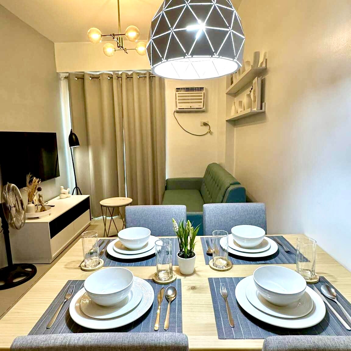 A cozy modern Scandinavian/tropical retreat nestled in the heart of the city. This is a place where you can relax, unwind and have fun with your loved ones or just by yourself. The living area is adorned with light-colored wooden floors, providing a warm and welcoming ambiance. Furnished with simple yet stylish Scandinavian/Tropical furniture. The kitchen is fully functional. Equipped with all your cooking needs. The bedroom’s minimalist design will for sure give you a restful night’s sleep.