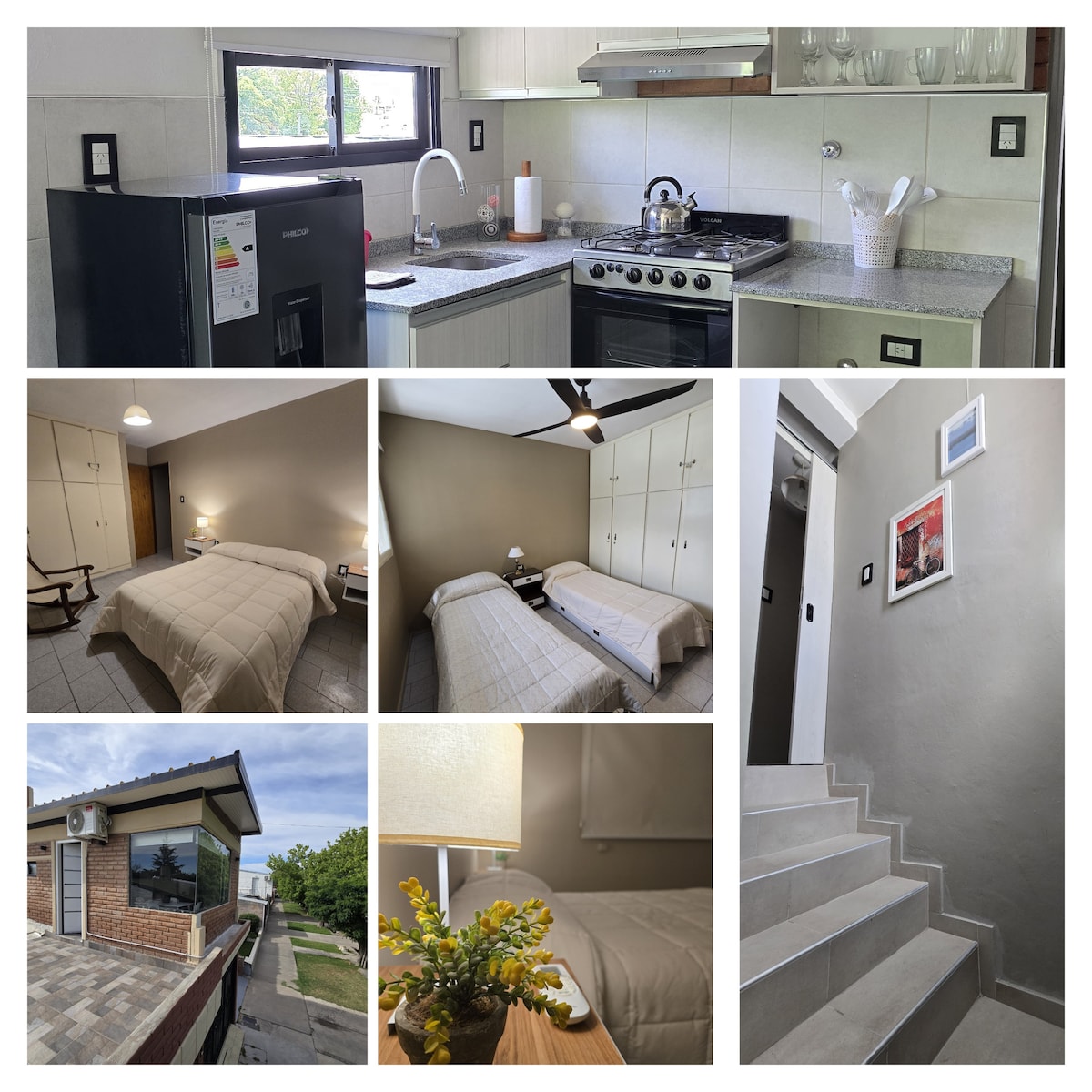 Disfruta de una experiencia con estilo en este alojamiento céntrico. Ubicado a 2 cuadras del km cero de San Rafael, tranquilo ( departamento interno, se ingresa por pasillo) , seguro, (cámaras de monitoreo en pasillo de acceso). Dispone de Cocina completa, mesa, sofá de 2 cuerpos, heladera, lavarropas, aire acondicionado, cama sommier King 2 x 1.80 m, baño con box de ducha, calefacción. Dispone de cochera en playa de estacionamiento privada. Importante: Apagar aire acond. al salir de excursión.