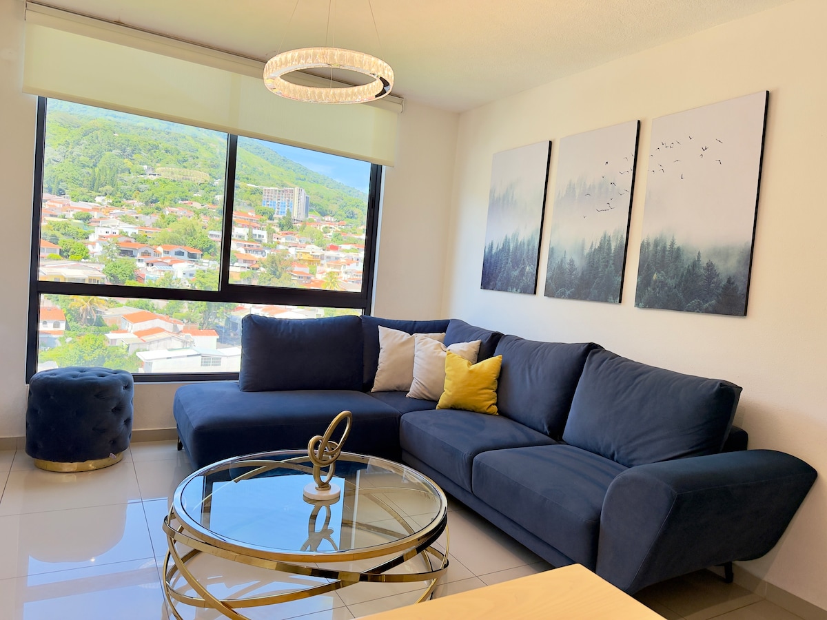 Moderno, lujoso y totalmente equipado, con vista espectacular a la cuidad, perfecto para viajes de negocio o turismo, individual o familiar; estarás cerca de todo en la cuidad de San Salvador, cerca de los mejores restaurantes y bares de San Benito Capacidad para 6 personas, 3 habitaciones, 2 baños completos , un baño social, smart TVs, Wifi, completamente equipado con aire acondicionado sus , área de lavandería y terraza. Condominio ubicado en una de las mejores zonas de la cuidad.