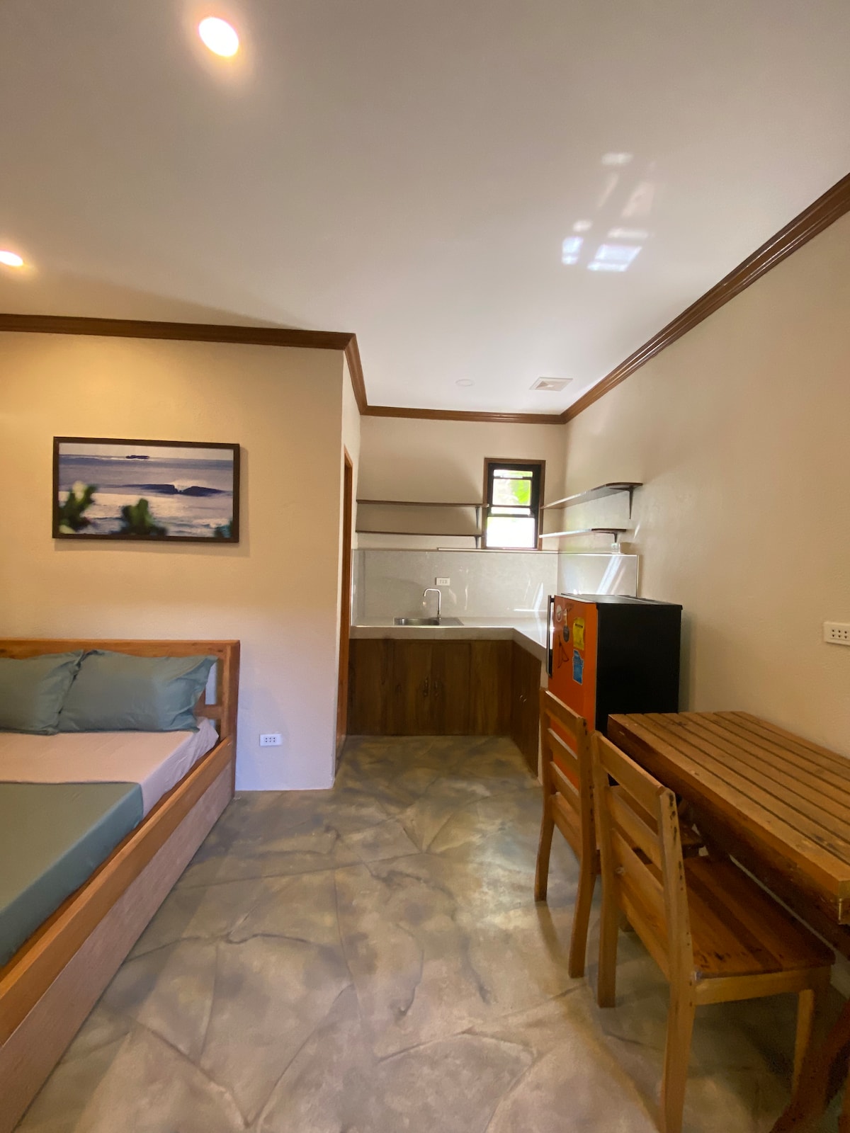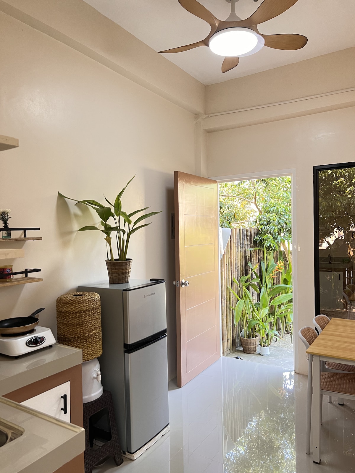 Strict quiet hours (9 PM–7 AM). Max one visitor. No balcony use during quiet hours. Located in a quiet part of downtown General Luna, away from bars yet walking distance to restaurants and essentials. Set in a gated, family and pet-friendly compound. Fully self-contained with private kitchenette, large fridge, cooking/dining essentials, storage, TV, hot shower, A/C, covered balcony/patio, and fast fiber internet. Ideal for peaceful stays, not late-night gatherings.