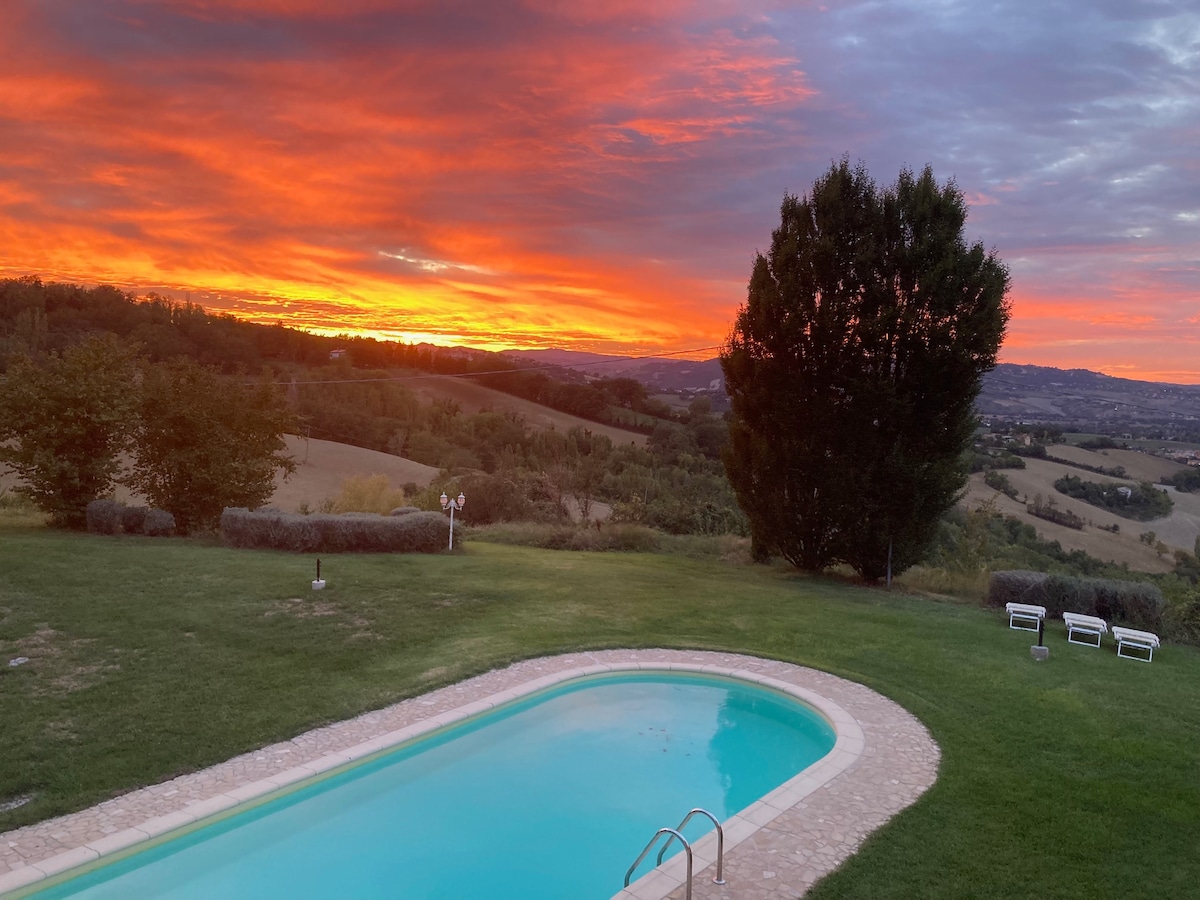 PEREMAJA - VILLA (eksklusiivseks kasutamiseks) panoraambasseini ja suurepärase vaatega rohelisele ja mäenõlval asuvale maastikule. Asub mäenõlval Romagna ja San Marino ranniku lähedal, ideaalne koht külalisele, kes soovib nautida maapiirkonna rahu ja tohutuid vaba aja võimalusi, mida pakub hektiline Aadria Riviera. Ilus väliveranda. Ainulaadse vaatega bassein pakub võimalust veeta kuumad suvepäevad täielikus lõõgastumises .
