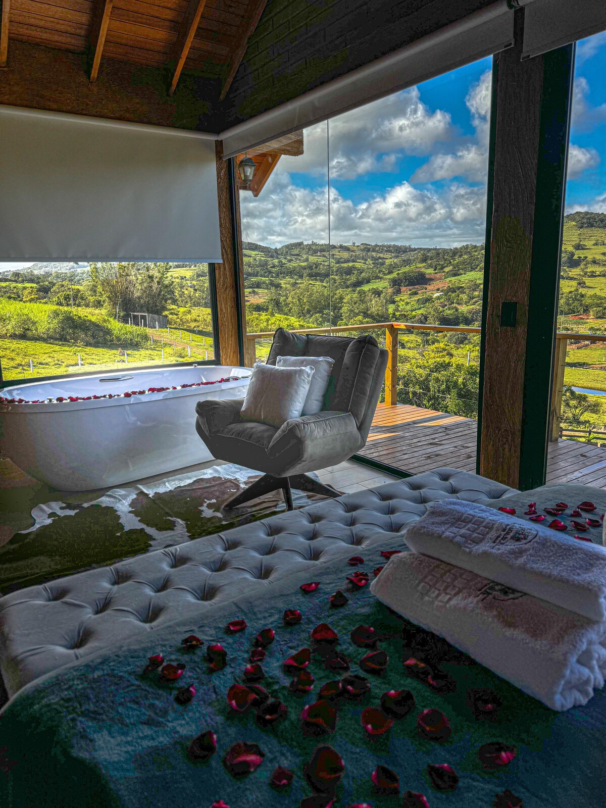 Cabana Sou Aconchego Refúgio aconchegante e sofisticado cercado pela natureza, ideal para casais, mas comporta até 4 pessoas. A cabana oferece banheira de hidromassagem, Wi-Fi,cozinha completa, banheiro amplo com box de seixos, sala com sofá-cama, mezanino com cama king-size, deck com rede relax e fire pit externo. Cercada por belas paisagens, o entorno conta com vaquinhas,ovelhas mansas que os hóspedes podem alimentar. Perfeita para relaxar, curtir a tranquilidade e apreciar uma vista incrível!