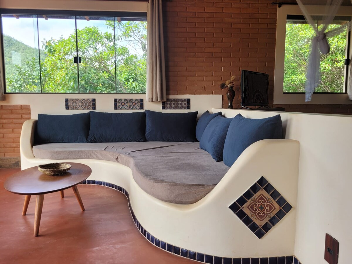 PROMO2026 (janeiro-abril): reserve 3 diárias e ganhe 1 dia, exceto feriados. Aqui, o tempo desacelera. Nossa casa é um refúgio acolhedor, perfeito para se conectar com a natureza, descansar e viver momentos mágicos — em casal, com amigos ou em família. A vista para o nosso "Jardim de Maytrea” emociona com um pôr do sol de tirar o fôlego. À noite, céu estrelado. De dia, tucanos, araras, beija-flores e seriemas. Trilha leva a banho de rio e piscinas naturais na reserva da Fazenda Flor da Mata.
