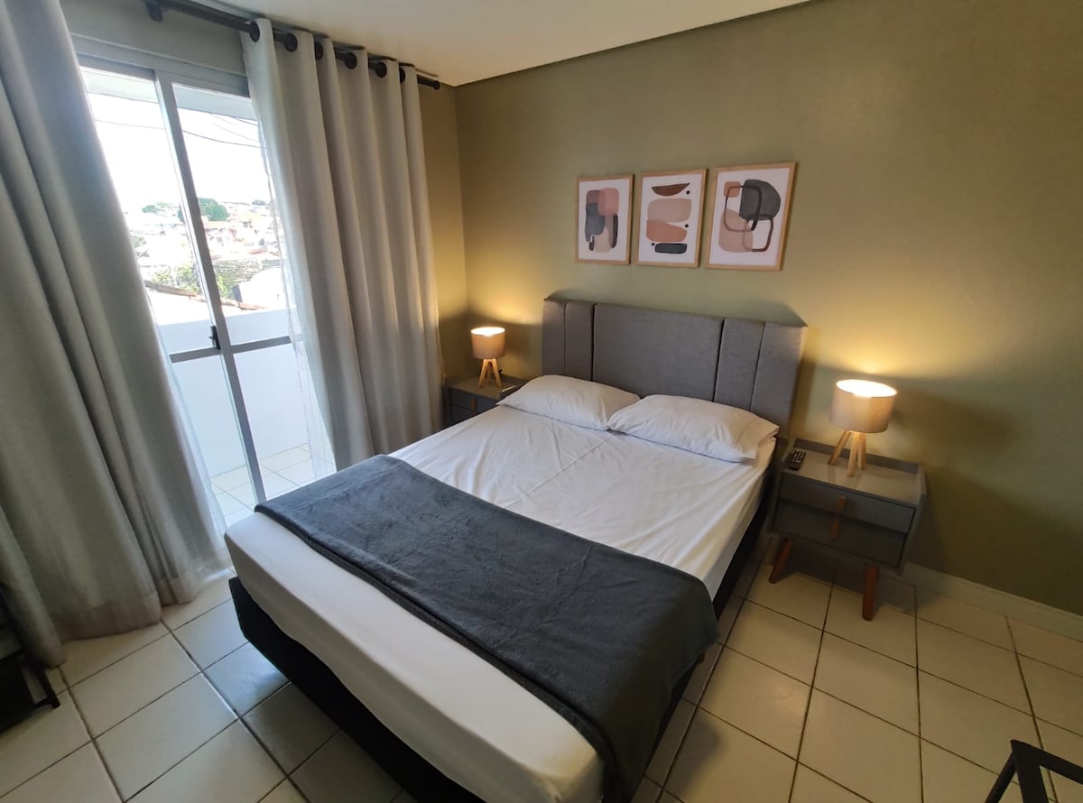 Studio de 49m2, sem divisórias, com sacada, wi-fi, SmartTV, sofá retrátil, cozinha com cookietop, forno, micro-ondas, filtro, geladeira, jogo de panelas, talheres, cafeteira, liquidificador, sanduicheira, copos/taças, tábua de passar e varal de chão. Cama queen, lençóis, toalhas, ar ❄️ e 🔥, armário p/ 2 e cortinas blecaute. Tem ferro de passar e secador. Home office. Piscina/garagem/academia/lavanderia. A 2 quadras de supermercados, cafés, farmácias, bares, restaurantes e academias.