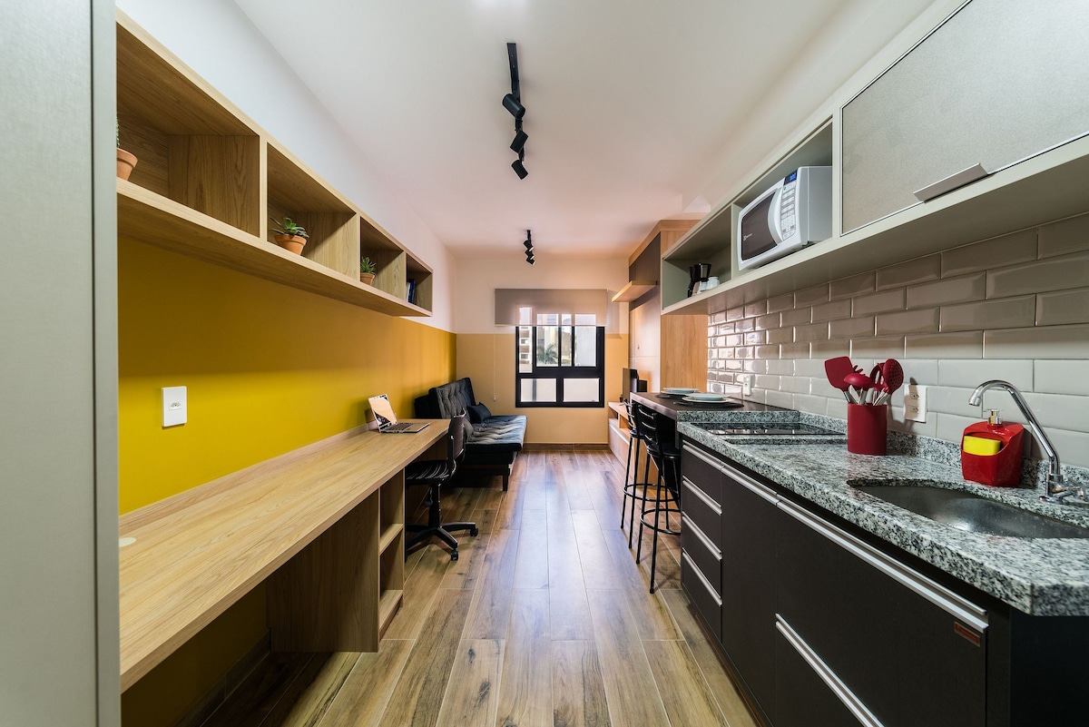 Studio equipado com vista (34m2 - 18º andar). Apto está ao lado da estação Brooklin do metrô, e 12 minutos de carro até o Aeroporto de Congonhas. . >> Locais próximos: . Hípica Paulista . Clínica Einstein . Consulado Americano >> Shopping centers próximos: . Shopping Morumbi . Shopping D&D . Shopping Ibirapuera . Shopping JK Iguatemi >> Você terá no condomínio: . Portaria 24h; . Academia; . Lavanderia OMO; . Coworking;