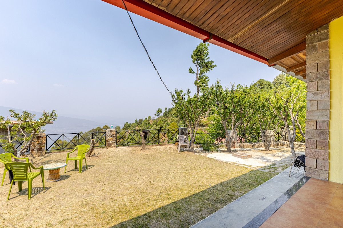 Wake Up in the Clouds – A Private Escape with 180 degree Himalayan Panorama. Pluck an Apple right from the comfort of your Balcony. Tucked away in the beautiful village of Shasbani in the serene hills of Mukteshwar, this private cottage offers an unrivaled front-row seat to the mighty Himalayas. Imagine waking up to seven layers of rolling hills, the sun rising over snow-draped peaks like Nanda Devi and Trishul, and a vast, uninterrupted skyline that stretches as far as the eye can see.