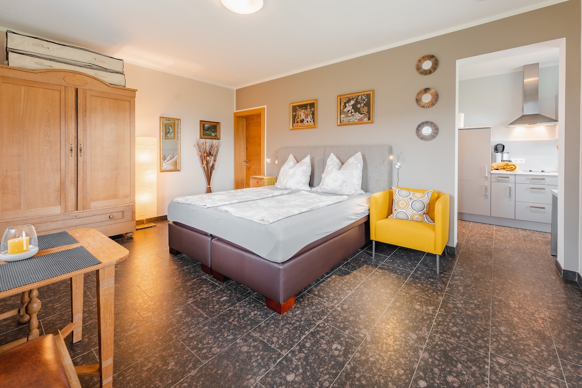 Täiesti uus elukoht koos ligipääsuga aias absoluutselt vaikses asukohas, kust avaneb fantastiline vaade kaugetele vaadetele Korter on umbes 40 ruutmeetrit. Seal on täielikult varustatud köök, söögituba ja magamisala. Kõik on korraldatud ühes toas nagu ühes stuudios. Kaetud terrass kutsub sind vahetama. Sisaldab päikeseloojangut ja alpide panoraami