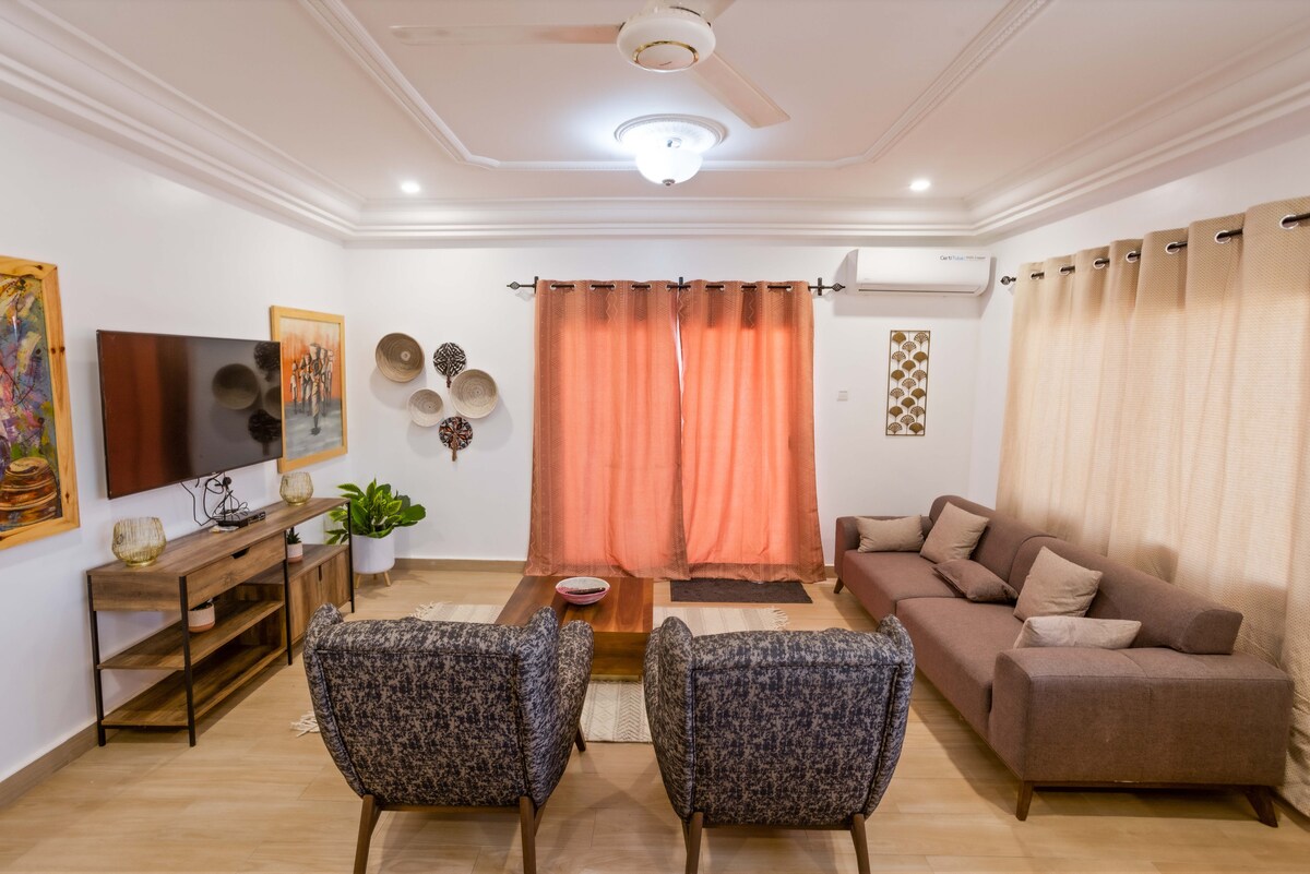 Avar luksuslik kahe magamistoaga korter Kerr-Serignis . Kogu maja on sinu päralt. Mõne minuti autosõidu või jalutuskäigu kaugusel Senegambia rannast, restoranist ja klubist. Sisustatud kõrgel tasemel. Elutuba kliimaseadme ja kahe laeventilaatoriga, avatud köök söögitoaga. Sviitmagamistuba laeventilaatori ja kliimaseadmega ning teine magamistuba laega ventilaator. Pane tähele, et toa hind ei sisalda elektrit. Teenustasu võetakse olenevalt tarbimisest eraldi. Palju tänu