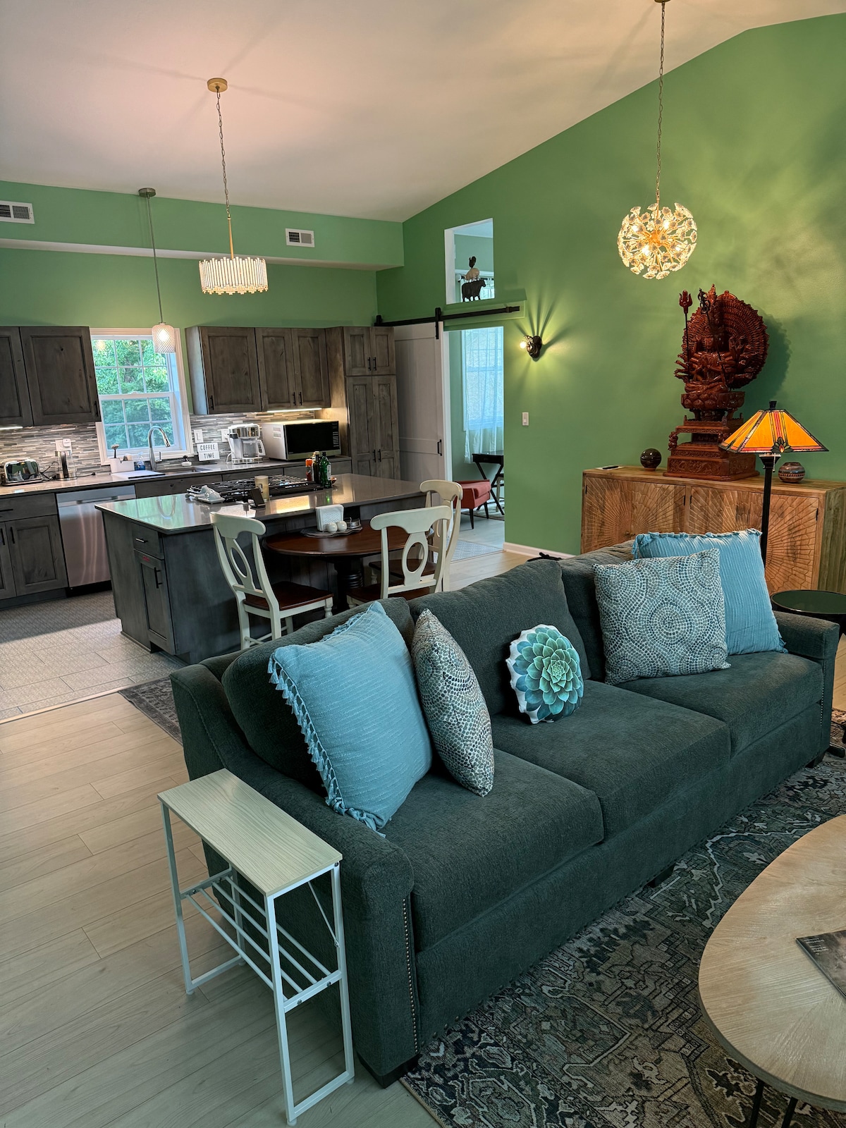 The whole group will enjoy easy access to everything from this centrally located place. The Boho house offers 4 beds - 3 up 1 down. (1 king/ 2 queen/ 1 full) 2 futon couches.. Enjoy time in the sun room, covered front porch, or the covered screened room outside. Plenty of space for everyone! Off street parking.