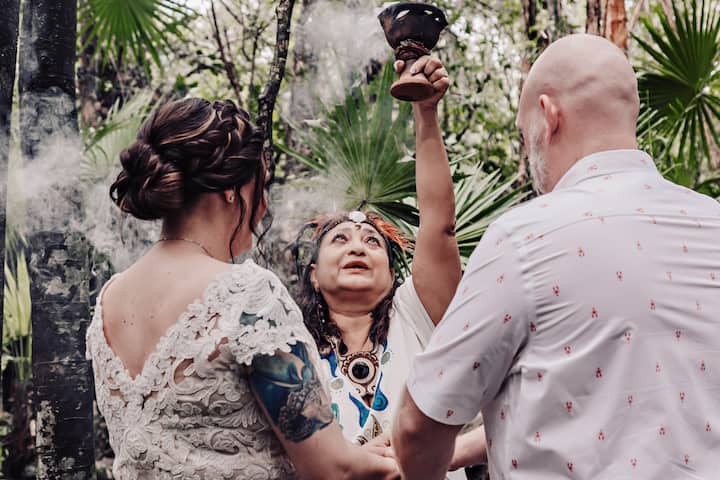 Intiimne ja vaimne tseremoonia, mida ümbritseb loodus, kus on cenote, kohalik šamaan, hispaania-eelne muusika, lilletahtri ja 100 fotot. Pealevõtmine Playa del Carmenist.