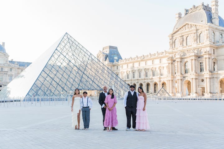 Fotosessioon Louvre 'i hoovis. Arhitektuuri ja püramiidiga suurepäraste piltide jaoks on palju kohti.