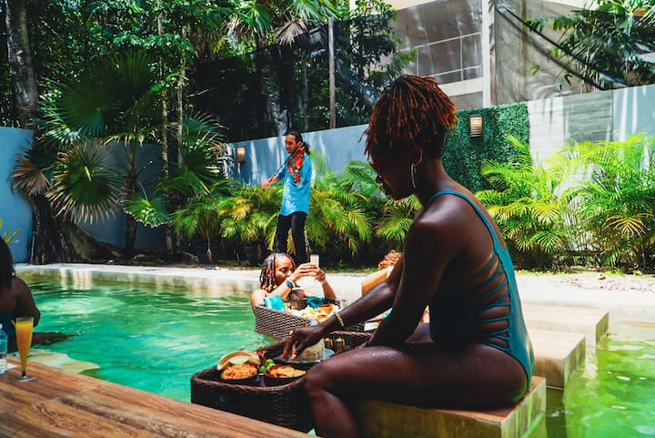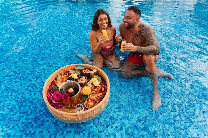 See unistuste einestamispakett vee peal sisaldab kaunistatud ujuvat kandikut ja valitud hommiku- või lõunasöögimenüüd ühele. Hommikusöögiks on valikus prantsuse röstsai või pannkoogid, peekon või vorst, munapuder, puuviljavaagen ja mahlad. Lõunasöögiks naudi kolme taco'd, riisi, ube, krõpse ja salsat ning agua frescat.