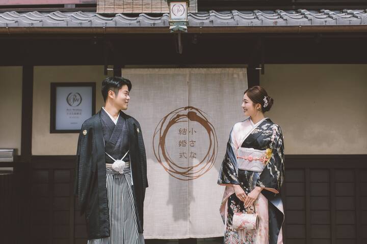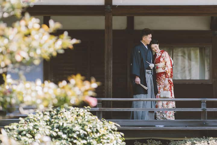 京都半日婚纱摄影体验,整体时间约5小时(含化妆与行程),实际拍摄约2–3小时。可穿婚纱、和服或便装;婚纱可提供,和服可协助预约。拍摄完成后提供约200–300张原图,其中包含24张精修照片。