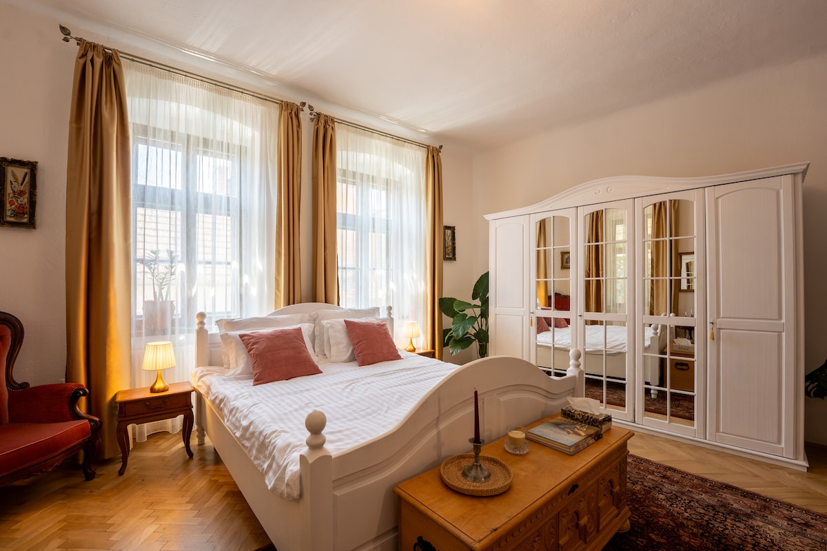 This is a recently restored historic property located within the heart of the UNESCO quarter of Sighişoara. The flat is very spacious (110 sq meters) and beautifully decorated. The kitchen is brand new (oven, hob, microwave, kettle, utensils, crockery, fridge, freezer, washing machine). The flat has two large bedrooms - a master bedroom (king size bed) and a twin bedroom (two single beds). The bedrooms are interconnected and offer majestic views of the city. The living room is really cosy.