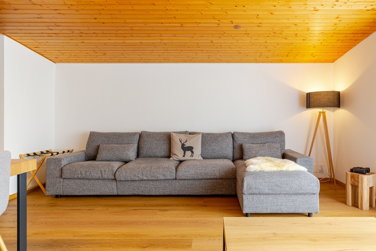 Suurepärane korter, sh 1 magamistuba kaheinimesevoodiga, elutuba mugava diivanvoodiga, köök ja vannituba. Kena terrass, väga päikesepaisteline. Mullivann ja saun. Privaatne parkimiskoht mägisuvila jalamil. Vabaduspass 2 inimesele mai lõpust novembri alguseni (tasuta bussid, tennis, bassein ja rohkem kui 20 tasuta tegevust! 50% soodustus köisraudteedel) Uus: terminal elektriauto laadimiseks.