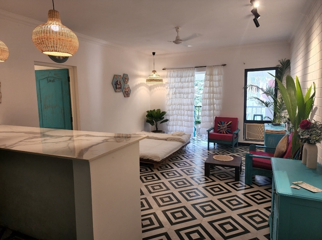 Modernne boheemlaste korter | Mõne minuti kaugusel Põhja-Goa randadest. Hubane, täielikult sisustatud 1BHK puhkepaik esimesel korrusel, mis sobib ideaalselt paaridele, sõpradele või väikestele peredele. Esiletõstetud osad: - Stiilsed boheemlaslikud interjöörid sooja õhustikuga - Konditsioneer magamistoas ja elutoas mugavuse tagamiseks - Nutikas teler + kiire wifi - Varustatud köök RO vee, pliidi, külmiku ja pesumasinaga - Jagatud bassein (kell 9.00-18.00 | ujumisriided kohustuslikud - Kohapealne jõusaal on saadaval hinnaga 200 INR inimese kohta päevas - Ööpäevaringne turvalisus - Tasuta parkimine