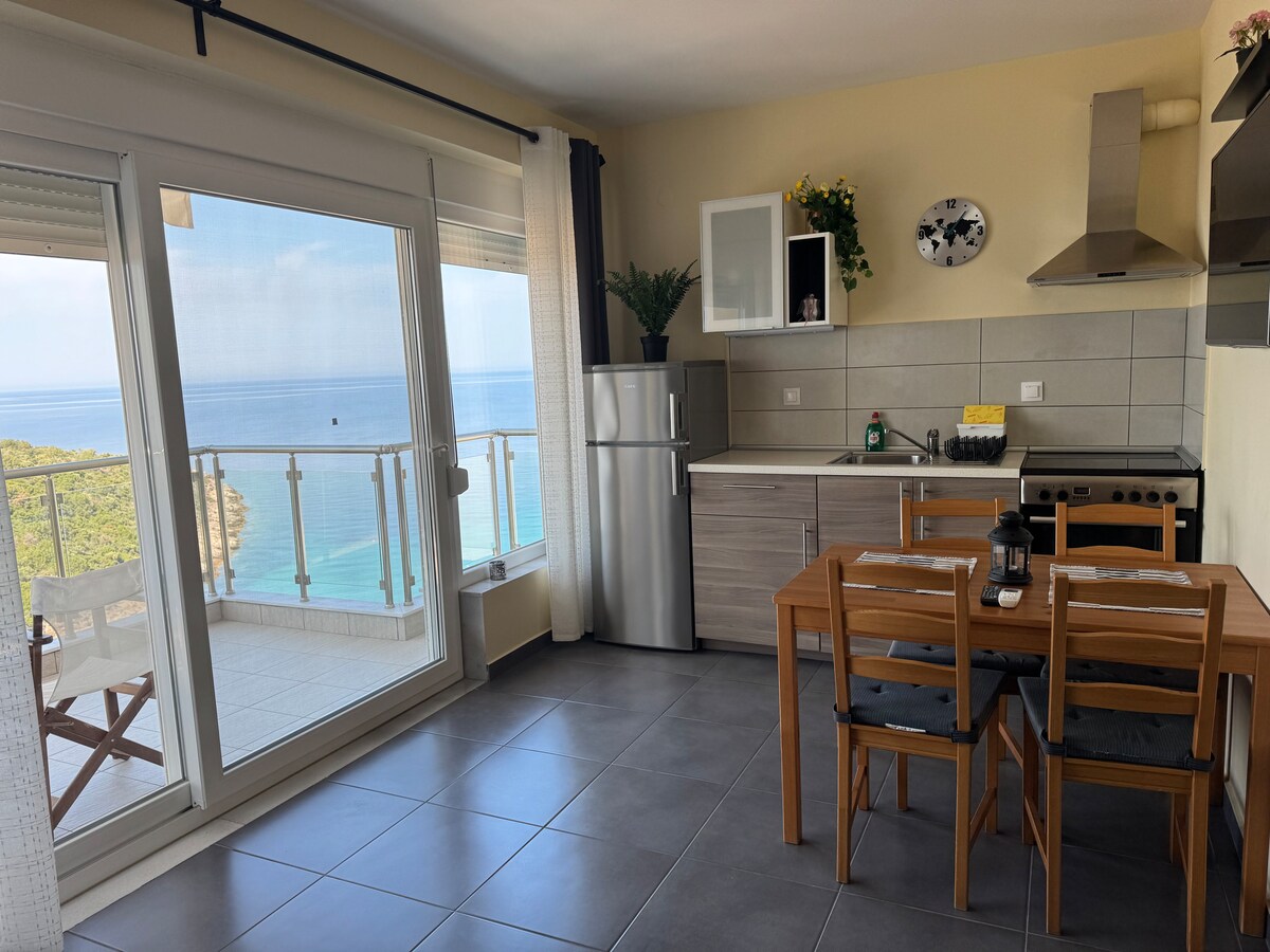 See on uus ühetoaline korter Atspase ranna kohal Skala Marionis, Thasoses. Korter on 5 minuti kaugusel jalutades randa, kohalikesse restoranidesse ja kõrtsidesse ning supermarketisse. Sulle meeldib korter vaatega rõdult ja maja siseruumidest. Sa lähed nautida ilusaid päikeseloojanguid ja kui teil on õnne, saab vaadata delfiinid, mis mööduvad.