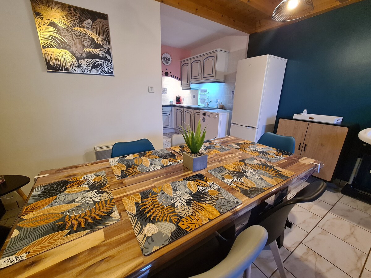Võluv 60 m² kookonimaja kuni neljale inimesele, mis asub vaikses elurajoonis ja pakub: -1 parkimiskoht privaatse külje esiküljel, mis on suletud barjääriga. - Taga 700 m² suurune suletud aed, mis pakub rahu ja privaatsust (suletud) - Välivarustus: vihmavari, grill, 2 terrassitooli, laud, toolid ja pergola, 1 aiamööbel - Saadaval on puhastusvahendid. Sees suitsetamine keelatud. -Mölkky mängud on saadaval.