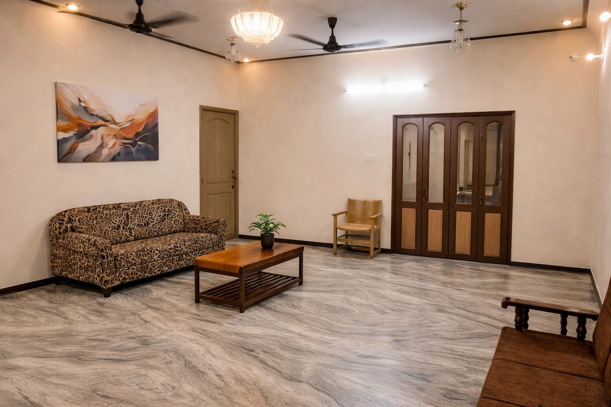 Cozy and modern 3BHK Airbnb just 2.5 miles from Madurai Railway Station🚉 Perfect for an enjoyable stay. 🏡 Fully furnished, 3 spacious bedrooms🛌with washing machine, fridge, fully equipped kitchen. Home has 8 ceiling fans🪭Has RO water🚰,iron box, exhaust fan, laptop work table, dining table, water heater, WI-FI🛜 a swing !__! Home has neem trees in all 3 sides. 🌳 Secure car parking. 🅿️ Living room and one bed room have smart TVs.📺 Flexible check-in &check-out time