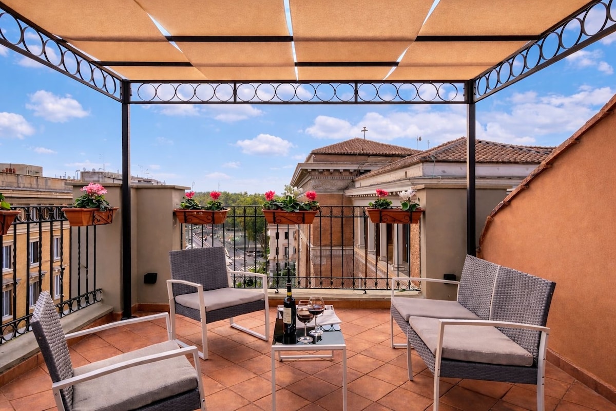 See ainulaadne maalähedane, kuid elegantne pööning on täis detaile puidust, metallist ja kivist, kõik käsitsi tehtud Giulio, tema omanik. Muinasjutuline terrass võtab su hinge kinni. Kuidas oleks kohviga, millel on sussid jalas, samal ajal Colosseumi planeerides või vaadates päikeseloojangut Vatikani varju taga onni vannist? Asub mõne minuti kaugusel Termini jaamast, kuid siiski rahulikus kodus. Juurdepääs korterile toimub treppide kaudu. Hommikusöök on meie kulul!