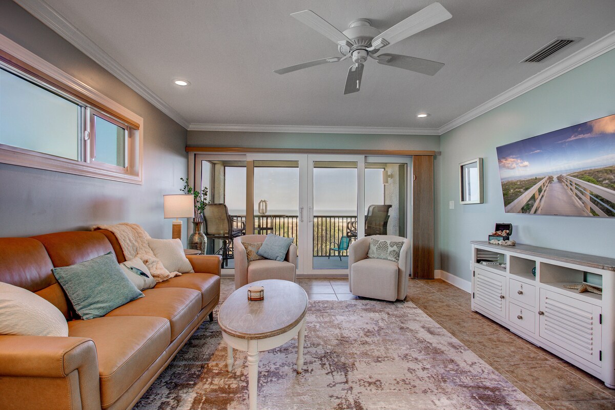 BEST spot to watch the sunrise, (and moonrise) on St Augustine Beach from every room in the condo and from the two direct beach front balconies! CORNER UNIT! TOP FLOOR! One balcony off the upstairs corner primary bedroom suite, walk in closet and ocean view King size beds in each bedroom. Anytime is a good time to be on the beach in St. Augustine! Winter Spring, Summer, or Fall! Besides being steps from the beach there are plenty of local eateries,great food, live music within walking distance.