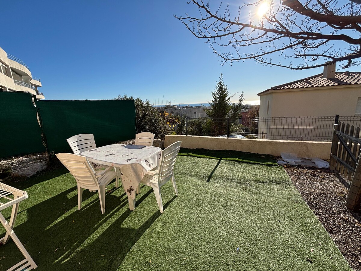 3-toaline korter, mis asub ideaalis lõunas/edelas ja pakub kogu vajalikku mugavust meeldivaks peatumiseks 2 inimesele. Seal on privaatne parkimine ja päikesepaistelise loggiaga aed, et nautida head ilma. Rand ja CAP3000 kaubanduskeskus on vastavalt 15-minutilise jalutuskäigu ja 5-minutilise autosõidu kaugusel. Lennujaamale ja staadionile pääseb 6 ja 10 minutiga autoga. Täielikult varustatud, sealhulgas kiudoptiline internetiühendus ja kõik läheduses olevad mugavused.