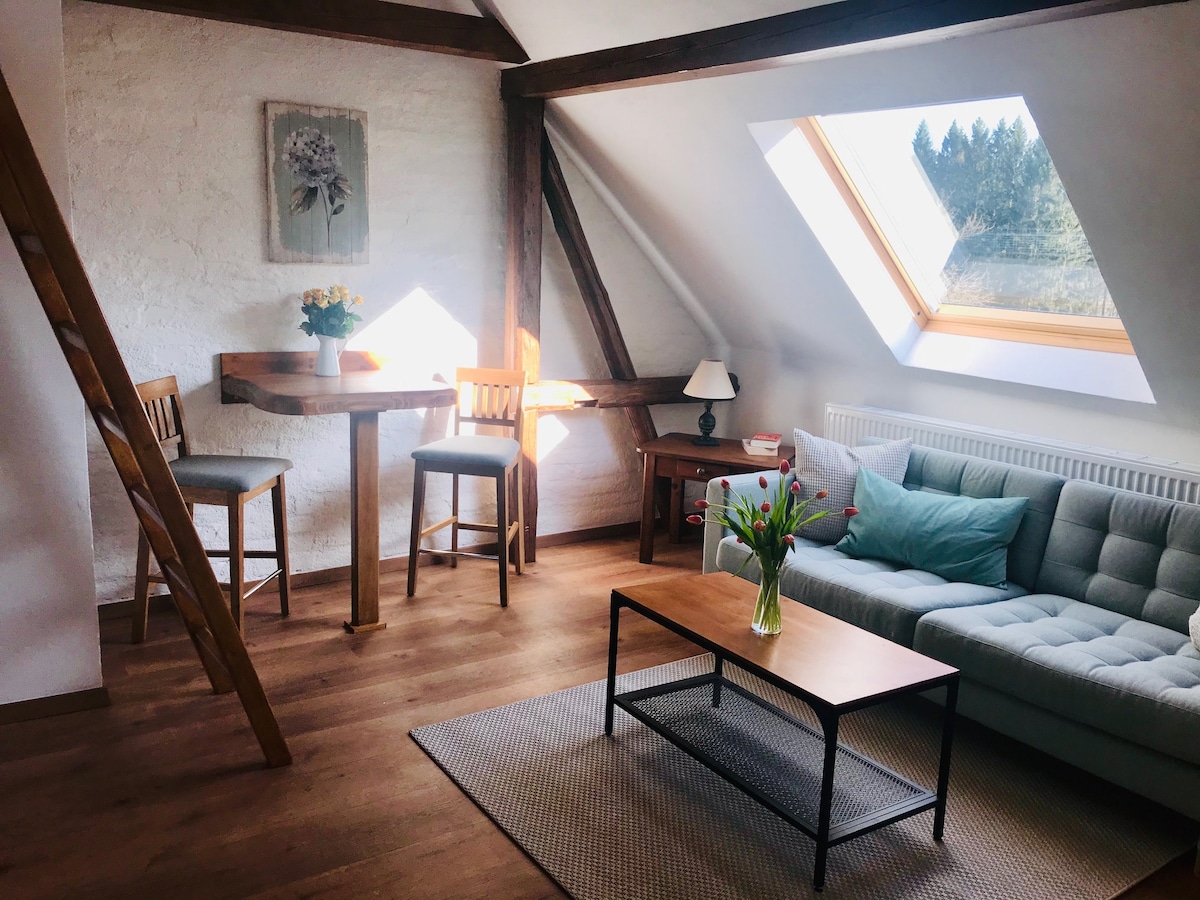 Ülemisel korrusel asuv korter on tõeliselt ainulaadne. See asub teisel korrusel ja kogu majutuskoht on taastatud algsesse hoonesse. Algne puitkatuse puitraam, paljastatud telliskivid, originaalne põrandakate, täielikult toimiv puupliit aitavad sul ette kujutada, millised inimesed eelmise sajandi alguses elasid. Peamine elutuba on näoga maja esiosa poole ja sealt avaneb vaade linnaväljakule, linnamajale ja kuulsale basaltkivile „Jehla“.