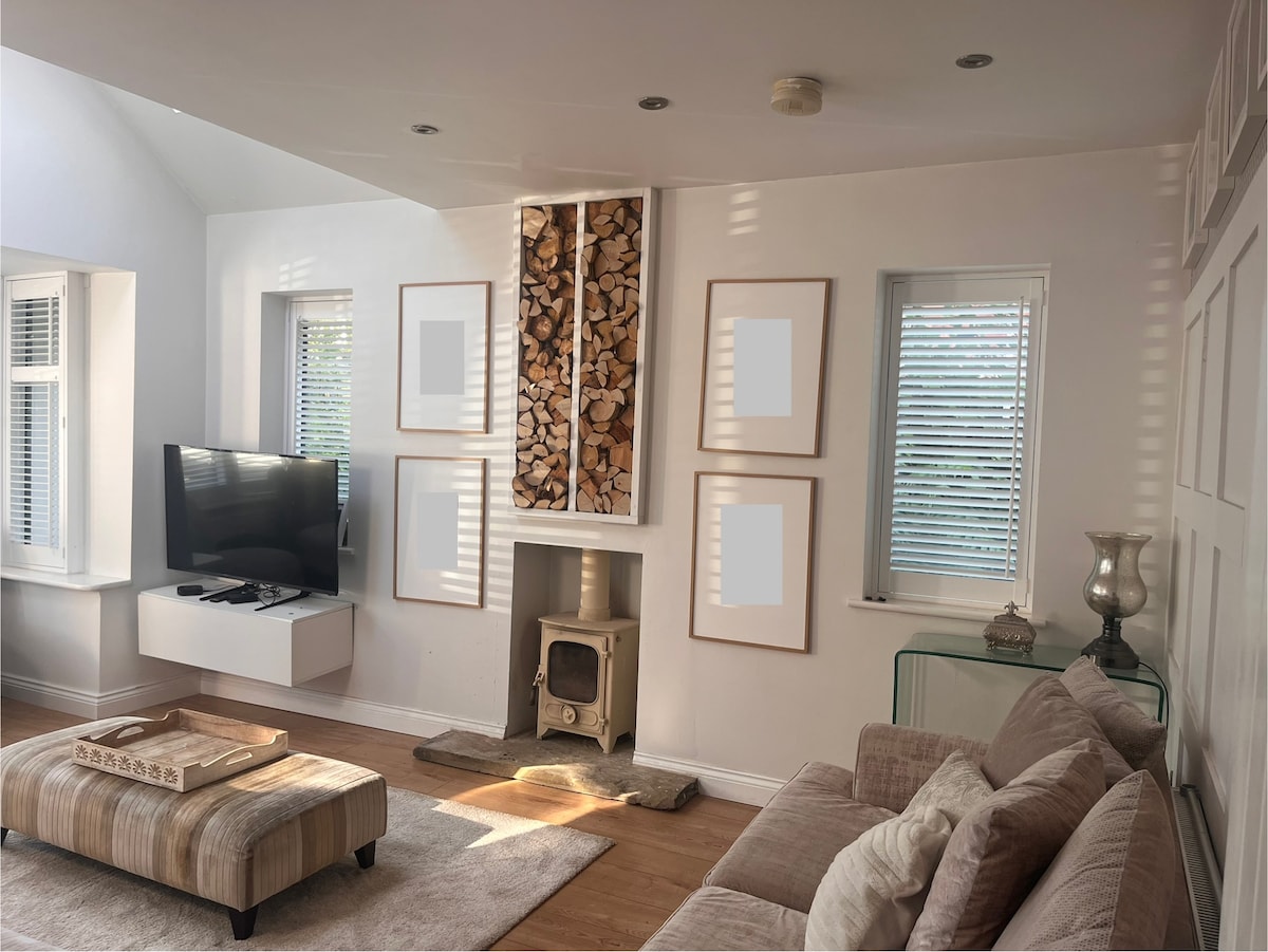 Converted barn with separate access and exclusive use of the entire self-contained space. Private off-road parking with Type 2 Charger for EVs. The bedroom includes a king-size bed and chest of drawers for storage. HD TV in lounge; WiFi (95mbps down); Alexa speakers with smart lights throughout (you can still just use the switches);voice-activated smart heating (again, you can just press the buttons); the fully-fitted kitchen includes kettle, microwave,FF, oven, and a Nespresso coffee machine.