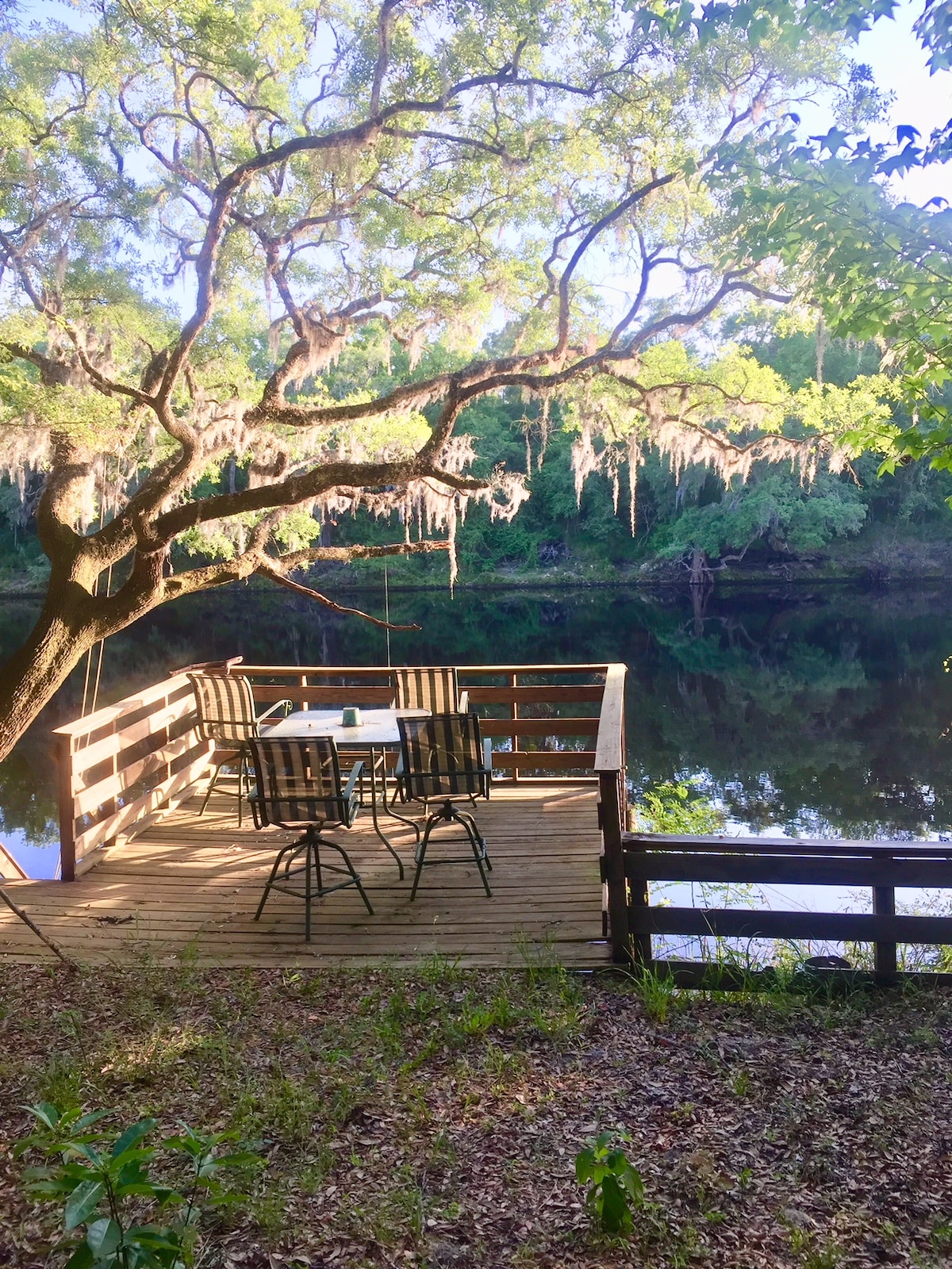 Eemal asuv hubane majake – kaks aakrit jõe ääres, kaks üheinimese kajakit + üks tandemkajak kasutamiseks 300 dollari suuruse kahju ja vigastuste vastutuse vabastusega. Privaatne jalutuskäik 500 jalga läbi metsa jõe äärde. Kaevuvesi on väävli- ja tanniinirikas, nii et võta joogivesi kaasa! Ülakorrusel on veel kaks magamiskohta. Selles Suwannee piirkonnas on palju allikaid. Sukeldujate paradiis, „Peacock Springs“ võrgustik on lühikese autosõidu kaugusel. Allikate kaart on olemas. Tingimused on jõe lõikes erinevad. Soovitatav on majutajaga nädal varem kokku leppida.