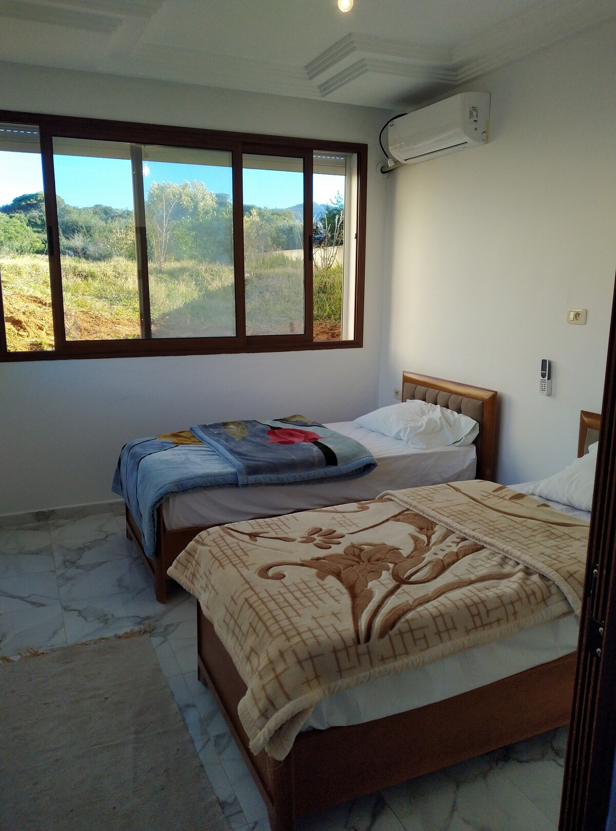 PETIT DEJEUNER INCLUS Véritable havre de paix, cette maison rime avec calme et déconnexion et vous offre l'une des meilleurs vues à Melloula, Tabarka. Ce logement est composé de 4 suites: Une suite pour 4 personnes et 3 suites doubles toutes climatisées et équipées de télé Divers services à la carte sont disponibles (nourriture, sortie, balades en mer en Flouka, paddle)