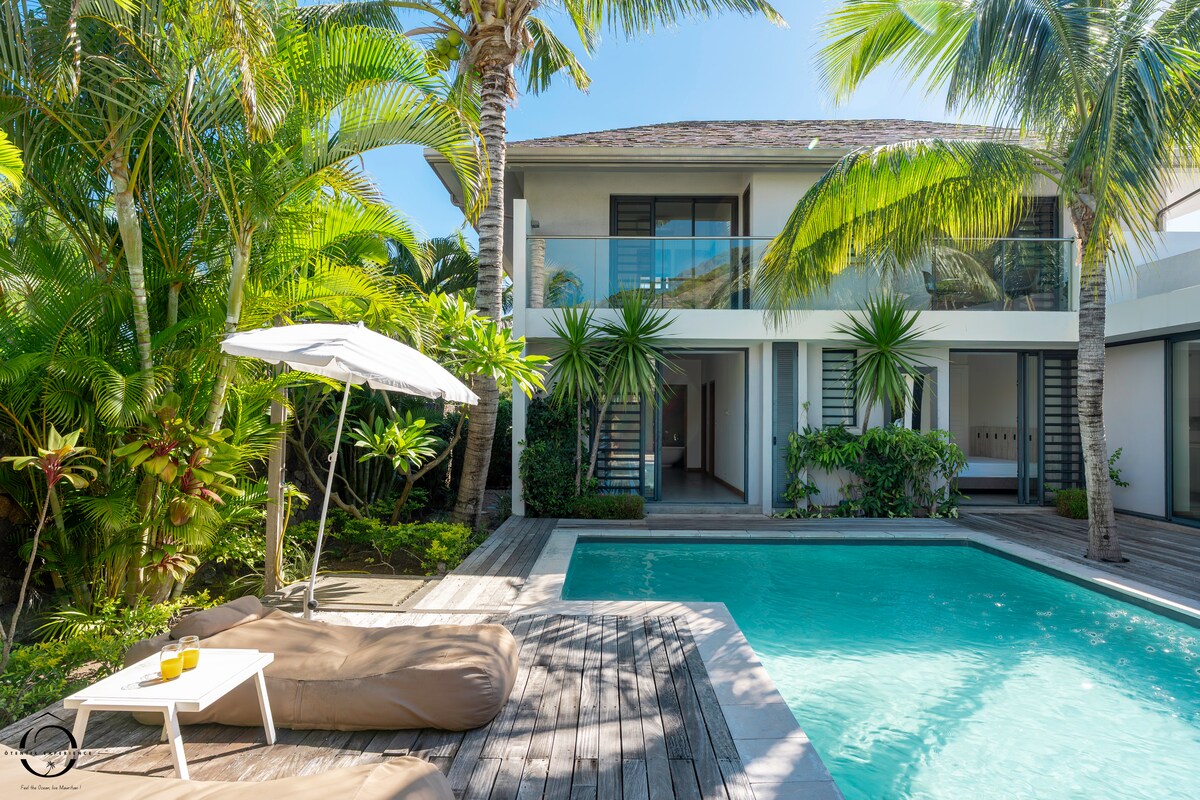 Mountain views are for the birds! ;-) Centrally located, 350m from a well stocked supermarket, and 3 minutes drive to the beach, this cosy home invites you to relax or go out to a wide ranging choice of restaurants nearby. In a tranquil dead end, surrounded by greenery, enjoy sitting on a wooden terrace, overlooking the common pool or relax on the 1st floor balcony while watching stunning tropical sunsets and sea views, overlooking Le Morne. Cleaning service three times a week included