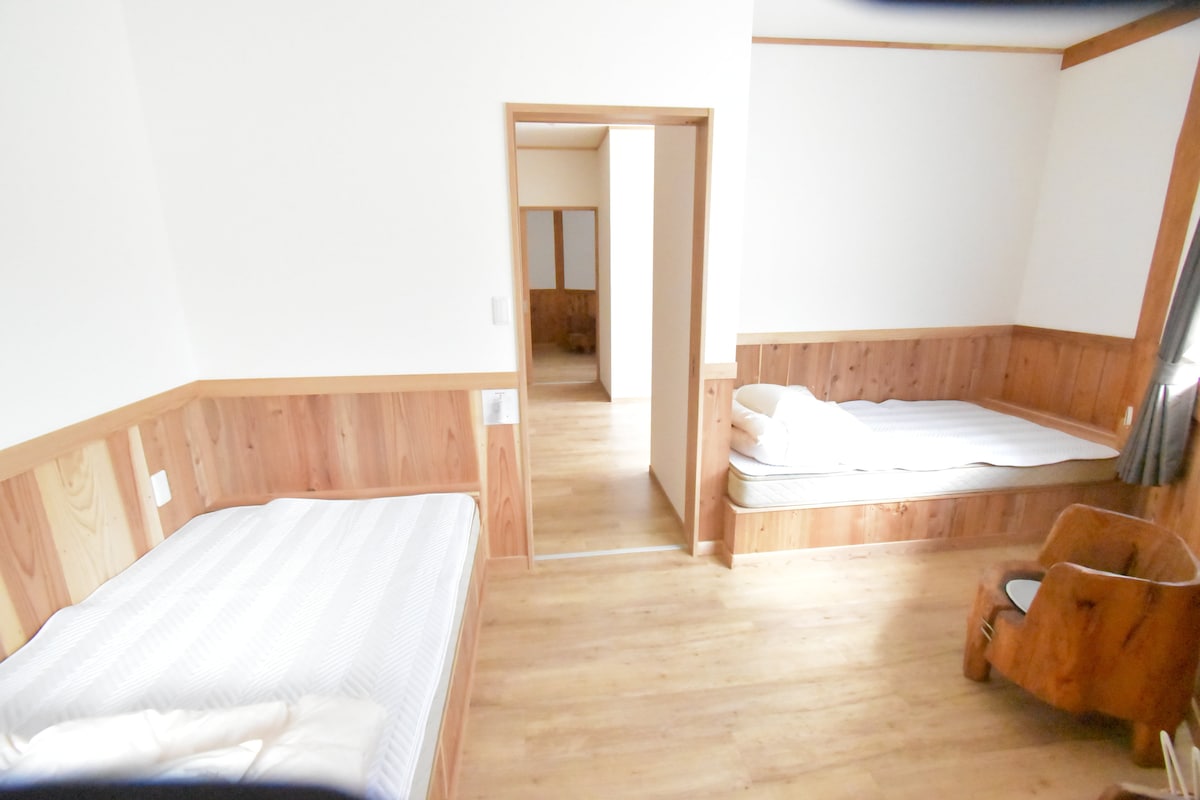 1軒家1組のみの貸切です(料金は人数により加算されます)。 16畳(8畳2間)のリビングルーム兼寝室と6畳寝室の2室で最大8名宿泊できます。 風呂、トイレ、洗濯機、キッチン、冷蔵庫を完備しています。フェイスタオル、バスタオル付。 無料Wi-Fiです。 部屋は2階にあり、隣家に音が聞こえにくいので小さなお子さんがいる家族や静かに過ごしたい方にぴったりの家です。 家の周辺は交通量や歩行者が少なく静かに過ごせます。
