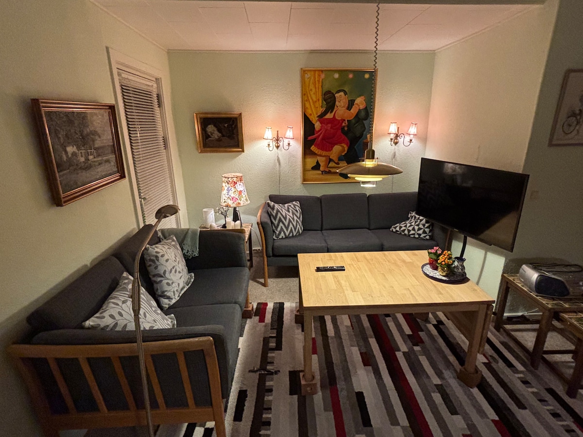 Discover a cozy basement retreat near the airport, city center, and beach. Enjoy a compact kitchen, spacious bathroom with floor heating, and a bedroom with a king-size bed. Relax in the shared garden area for a countryside feel. The airport is only a 15-minute bus ride away. Note: Upstairs apartments have pet-loving occupants; consider allergies to cats and bunnies.