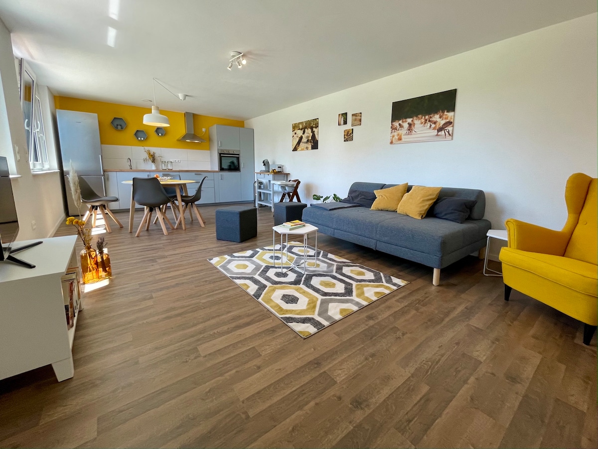 Lõõgastu meie hubases 65 m² duplekskorteris Bahlingeni vaikses äärelinnas. Ruumikas, valgusküllane elu- ja söögituba kutsub sind süüa tegema ja püsima. Kaks magamistuba ja valgusküllane päevavalguse vannituba asuvad keldris. + Ostlemine kohapeal. + 3 min jalutuskäigu kaugusel raudteejaamast. Sealt jookseb „Bähnle“ Freiburgi iga 30 minuti järel. + Konuse külalise kaart + Schwarzwald, Alsace ja Šveits vahetus läheduses. + Europapark Rust on 20-minutilise autosõidu kaugusel.