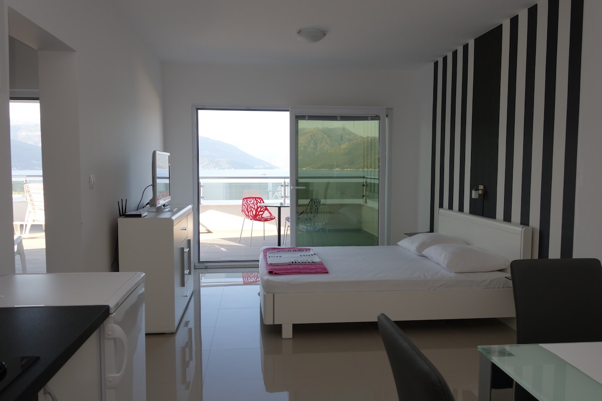 Tere tulemast meie kaasaegsesse ühe magamistoaga korterisse, kus on privaatne katuseterrass, avatud baar, köök, grill ja lõpmatu bassein. See rahulik puhkekoht, mis asub vaid lühikese 10-minutilise jalutuskäigu kaugusel Porto Montenegrost ja 4 km kaugusel Tivati lennujaamast, koosneb mugavast magamistoast, elutoast, täielikult varustatud köögist ja vannitoast, kus on juurdepääs privaatsele katuseterrassile koos lõpmatuse basseiniga. Broneeri oma majutuskoht ja koge Porto Montenegro, Boka lahe ja Tivati piirkonna ilu.