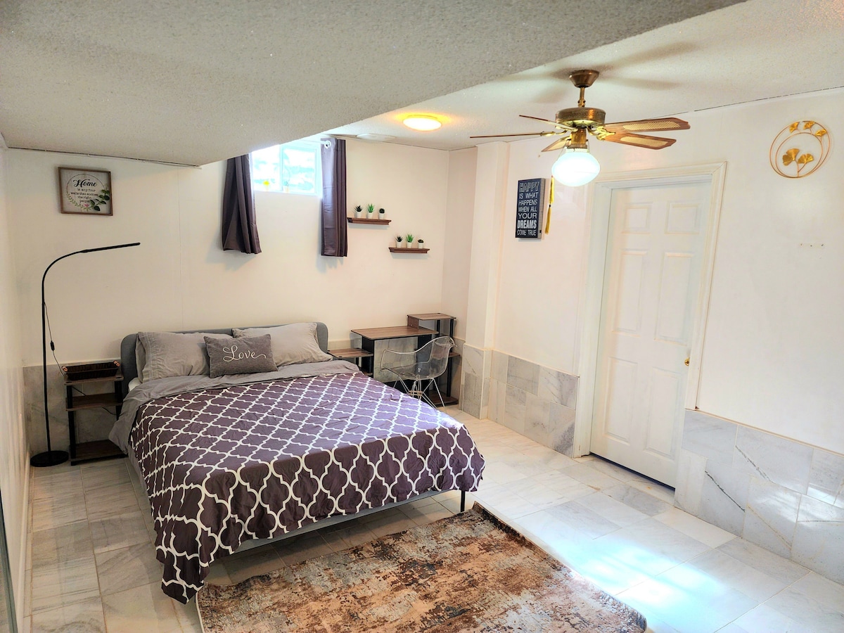 Hubane, valgusküllane, möbleeritud kõrgete lagedega keldrikorruse stuudiokorter, millel on eraldi sissepääs. Ideaalne lühiajalistele külastajatele Sheppr/Bathursti piirkonnas. Selles majutuskohas on väike köök, pesumasin/kuivati, täisvann, teler ja Bell 5G internet. Saadaval on Netflixi ja Prime-voogedastus. Suurepärane asukoht: 10 minutit Hwy 401, toidupoodide, restoranide ja kesklinna suunduvate metroode, Pearsoni lennujaama ja 5-minutilise sõidu kaugusel Rogersi staadionist. Vaikne, suitsuvaba ja lemmikloomavaba majutuskoht. Valju ja hilise pidutsemise korral ei ole teretulnud!