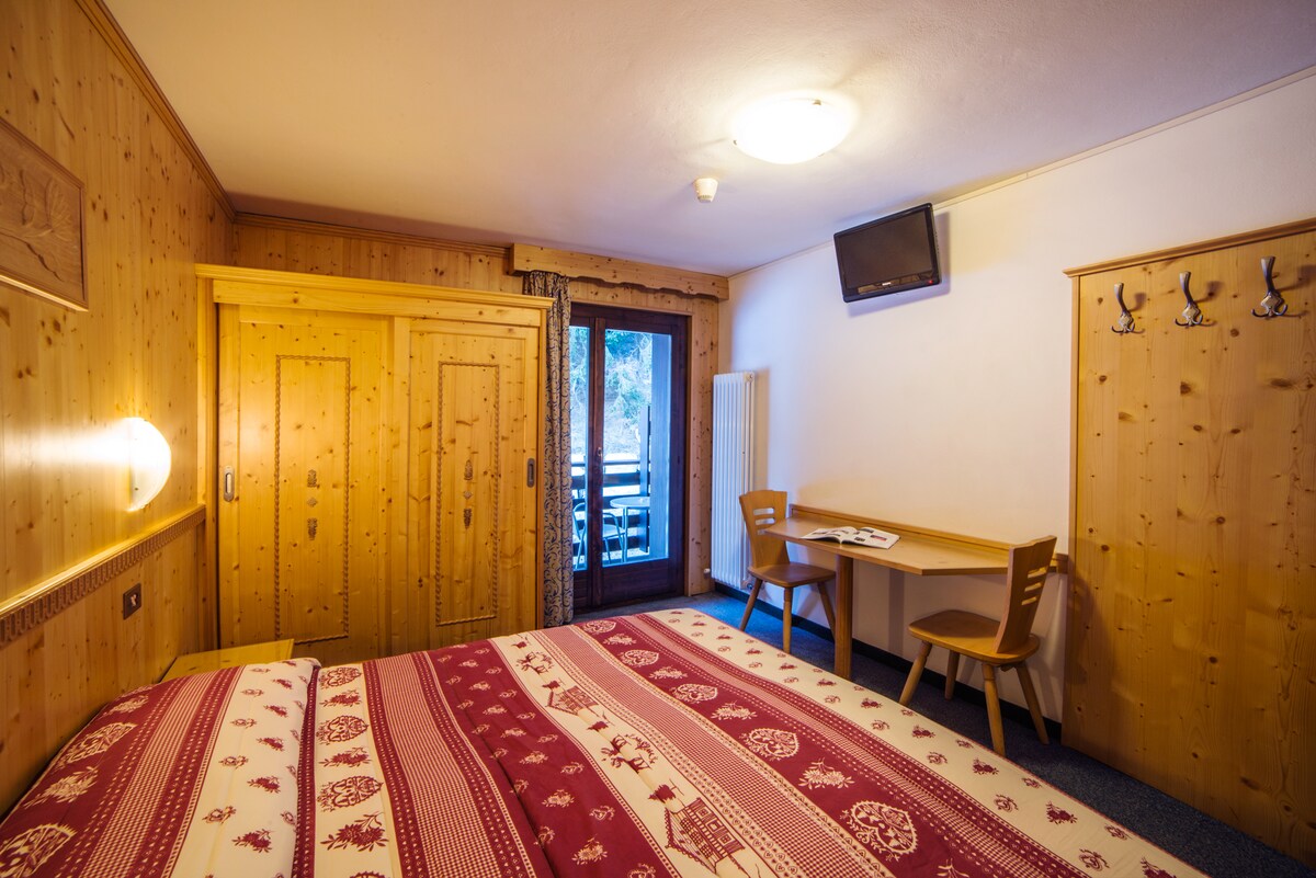 This room at Hotel Vallecetta offers a cozy atmosphere, featuring alpine-style décor with wooden furnishings. Each room has a private bathroom with a shower, hairdryer, Wi-Fi, and satellite TV. The design blends traditional alpine charm with modern comforts, creating a relaxing space ideal for couples, with extra beds available for families. A generous breakfast is always included ensuring a perfect day!
