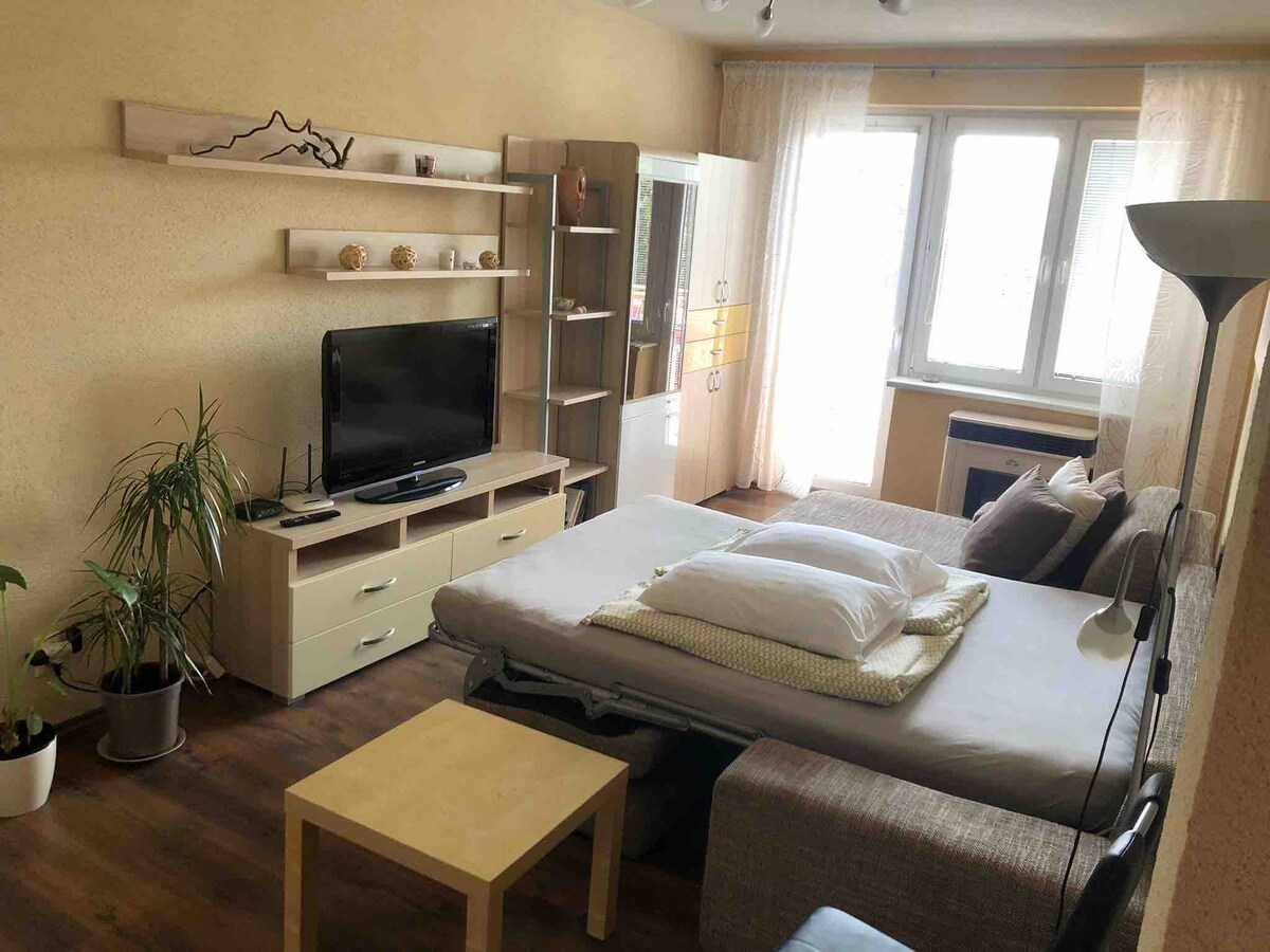 Ilus avar päikeseküllane korter suurepärases asukohas. Korter on 35 m2 ja standardist kõrgem suur vannituba 12 m2 koos vanniga. Köök ja külmik on täielikult saadaval. Otsitud asukohad: - kesklinn 10 minuti jooksul jalgsi - Loss 15 minuti jalutuskäigu kaugusel - Bussi- ja rongijaam jalgsi 10 minuti jooksul - MAKSIMAALNE ostukeskus 10 minuti jooksul jalgsi - Brezina metsapark 10 minuti jalutuskäigu kaugusel - Restoran on saadaval otse ruumides - Jalgpalli/hokistaadion 15 minuti jalutuskäigu kaugusel