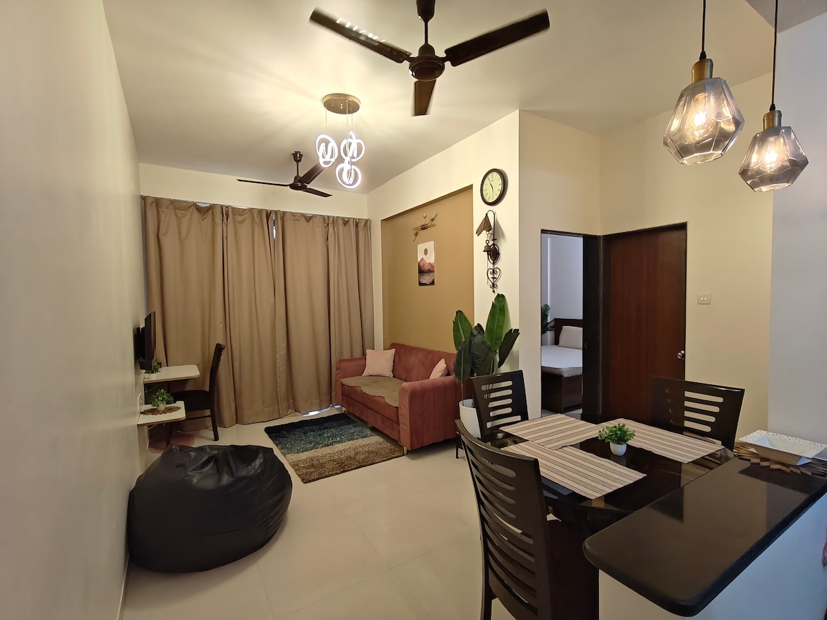 Cozy 1BHK, 10 mins from Mandwa Jetty—your lush green escape! Perfect for a breezy weekend, relaxing workcation, or longer stay. Sunlit living room, cloud-like king bed, balcony for morning coffee, and a chic bathroom with rainfall shower. Fast Wi-Fi, iron, hair dryer, and essentials included. Unwind in quiet surroundings with beaches and cafés nearby, with Swiggy and Zomato delivering to the area for added convenience. Where work meets wanderlust—come recharge by the sea!