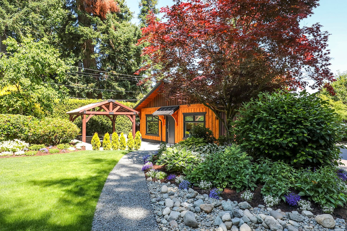 Welcome to Bellwood, your retreat in the forest within a short walk to the beach. You’ll enjoy the wrap around windows in this modern Danish meets West Coast guest house. Our home is just across the courtyard and we are available for whatever you wish, while respecting your ultimate privacy. The guest house is suitable for couples and solo adventurers. Close to beaches, parks and Chickadee Lake.