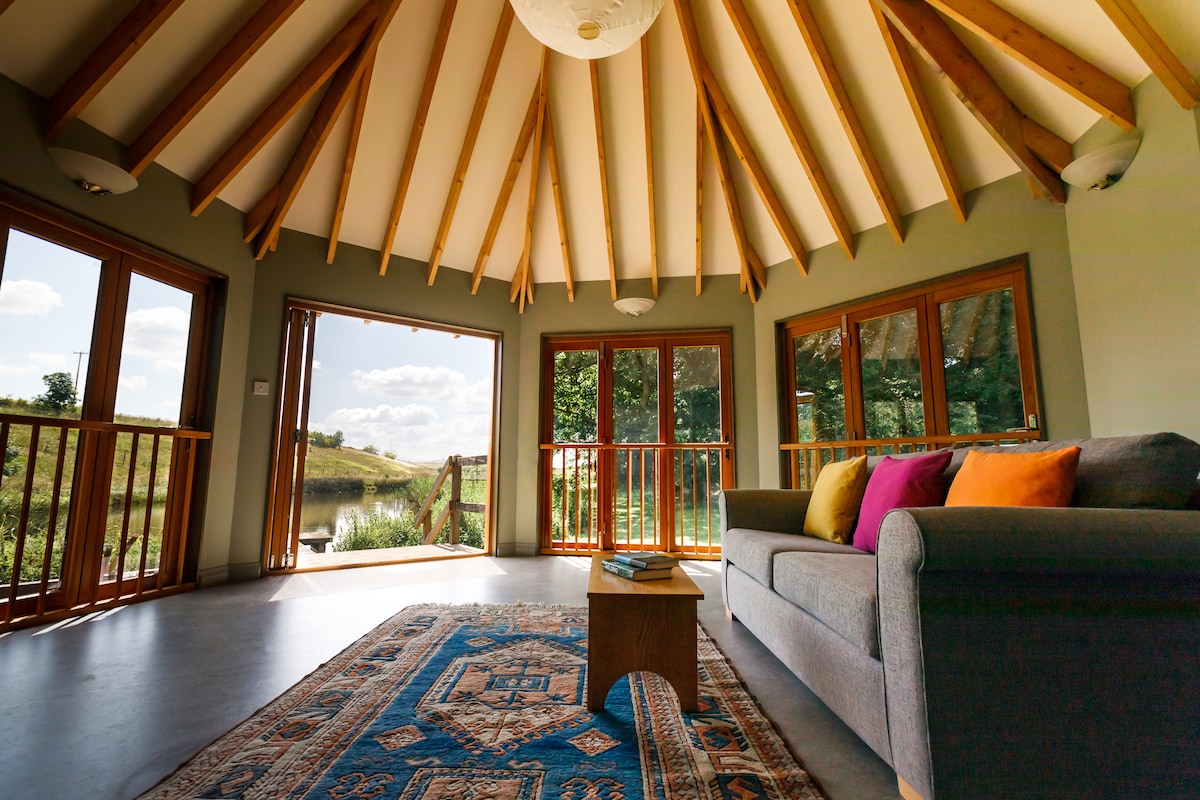 A unique lakeside hideaway nestling in a small tranquil valley for a romantic retreat or an off-grid nature escape. The lake views through the hexagonal frontage stretch down the length of the water. Pet friendly, this secluded quirky cabin with its own private swim spot is located on an organic farm within easy reach of London, Oxford and Bristol and is the perfect spot from which to explore the picture-postcard villages and historic market towns of the North Wessex Downs.