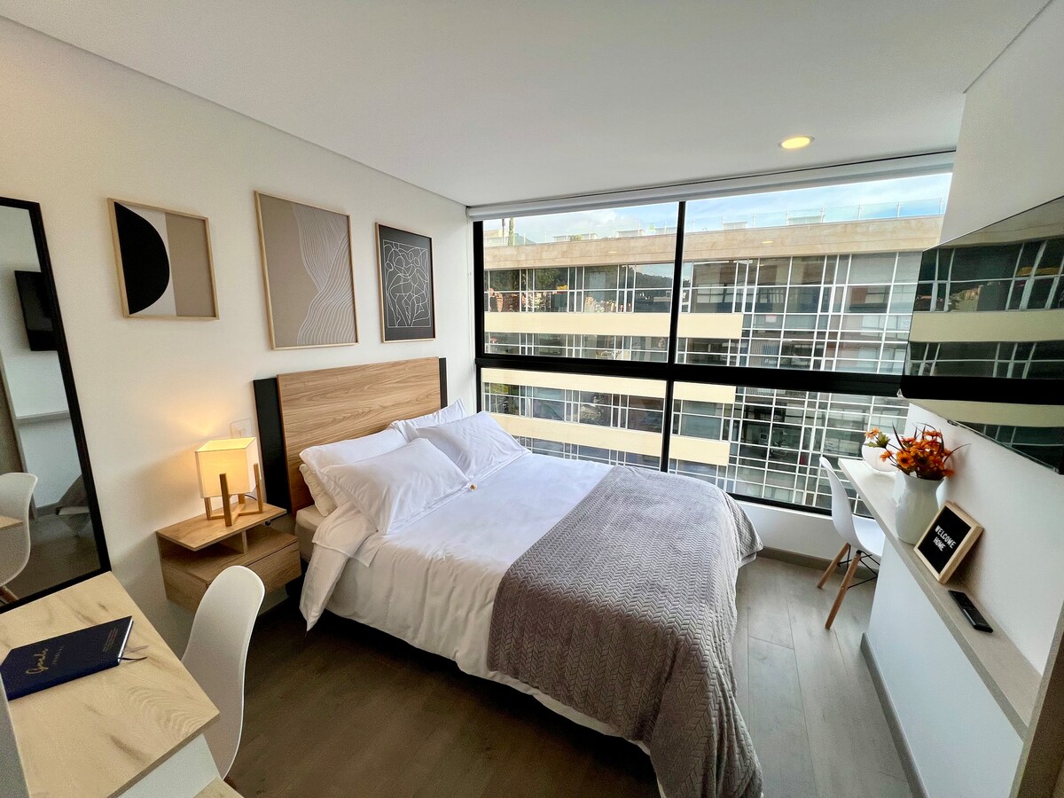 Naudi mugavust ja eksklusiivsust meie korteristuudio möbleeritud sviidis. See ruum asub strateegilises piirkonnas Universidad Militari, Fundación Santa Fe, Hacienda Santa Bárbara, Unicentro, Movistar Arena ja Parque el Virrey lähedal ning sobib ideaalselt üliõpilastele, professionaalidele ja peredele. Sellel on kvaliteetsed mugavused.