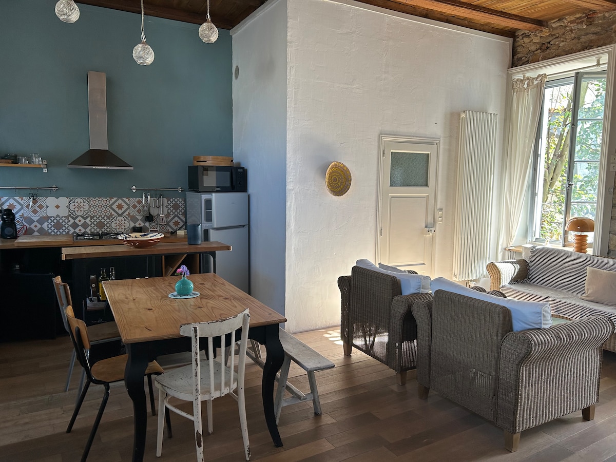 Bienvenue à la maison de Julie ! Un séjour ressourcement en bord de mer, accessible en train (1h de Nantes) et sans nécessité de voiture sur place, pour encore mieux déconnecter… Nous vous accueillons au rez de chaussée d'une demeure de caractère du 17ème siècle, située à 10mn à pied de tout : l'océan, les marchés, les commerces, les restaurants et terrasses… Pierres, bois, matières naturelles et couleurs choisies vous accompagneront pour un décor cocooning à souhait.